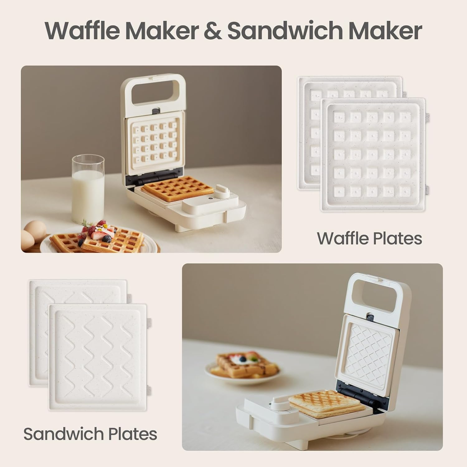 - Healthy Non-stick Coating: Thanks to the ceramic non-stick coating, the waffle maker with removable plates makes cleaning easier and simpler. Compared with the Teflon surface, our mini waffle maker is healthier and you can enjoy a satisfying meal.