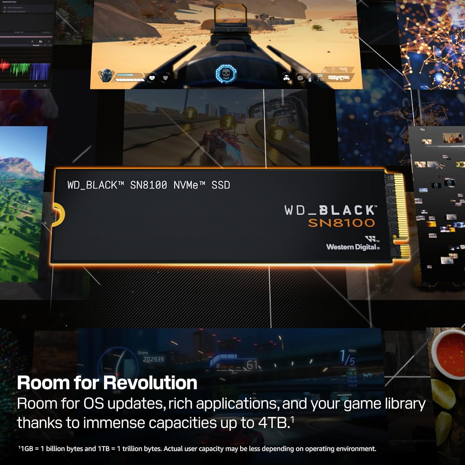 Build your new gaming or workstation system with our cutting-edge PCIe Gen 5 SSD, delivering blistering speeds up to 14,900 MB/s(2) for demanding tasks like high-level gaming, professional content creation, and AI applications. As an industry-leader for PCIe Gen 5 power efficiency, the WD_BLACK SN8100 NVMe SSD harnesses advanced TLC 3D CBA NAND technology to help ensure performance and reliability, while a low-power profile and optimized thermal performance keep your system cool and running smoothly. With up to 4TB(1) of storage and a suite of powerful features, this SSD is the ultimate upgrade for discerning users.