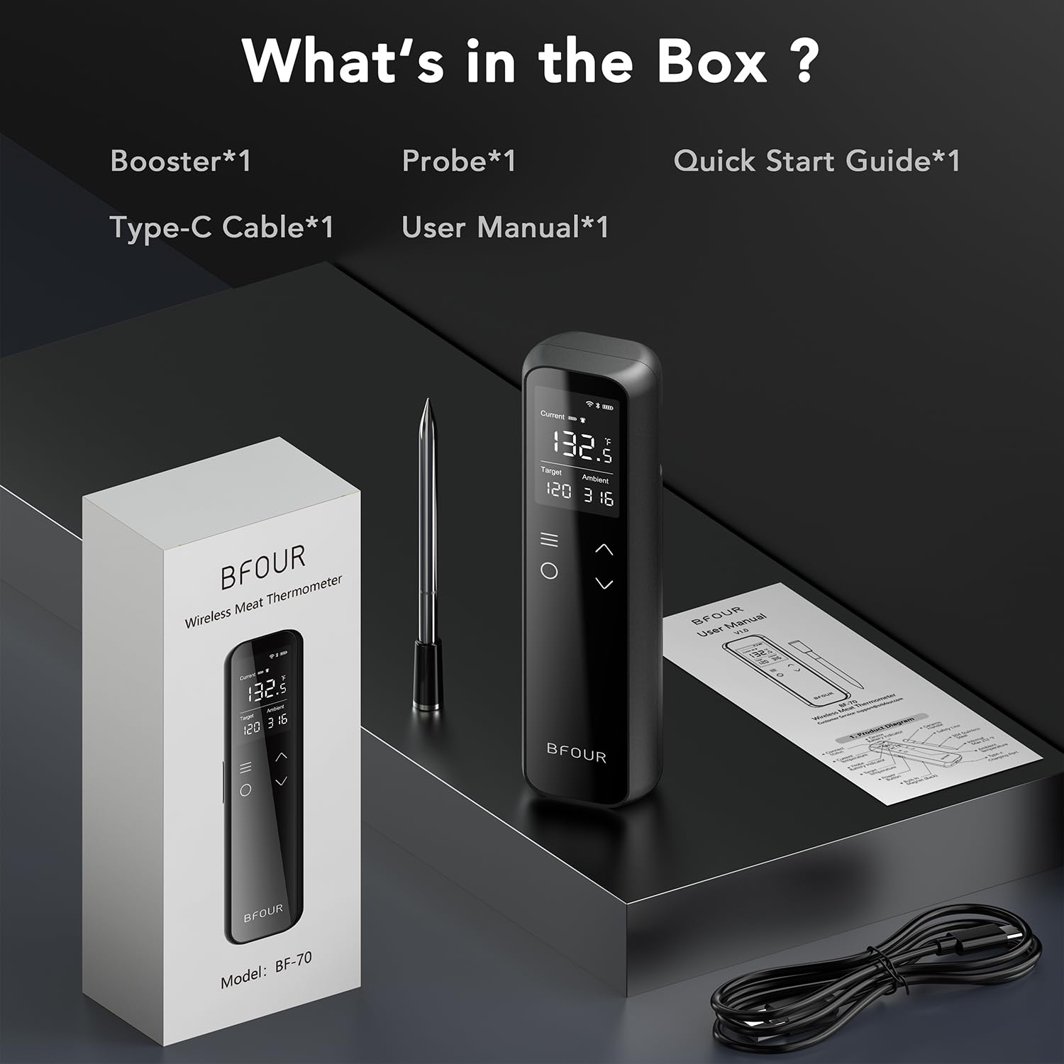 Included Components Wireless thermometer, probe, charging cable, user manual