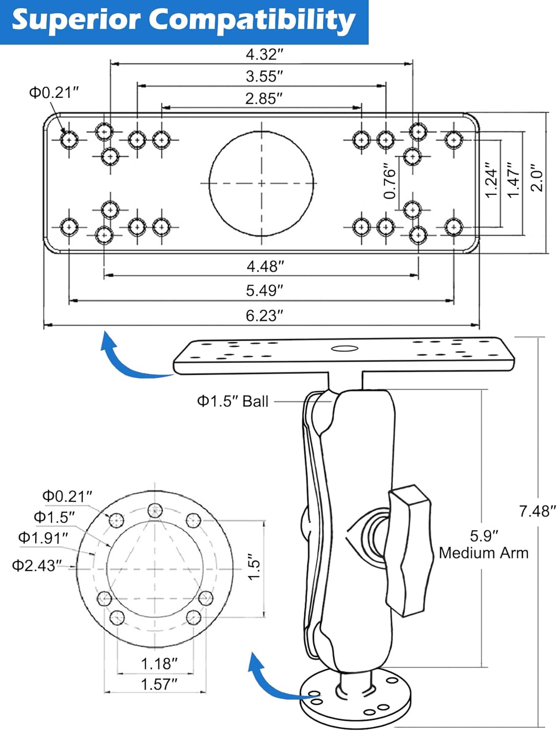 Includes a complete flat surface, drill-down mounting solution and a C size 5.5” length 1.5” double socket arm; The ball and socket technology allows for near-infinite adjustability. The mount is designed with a 1.5" diameter rubber ball and socket system that has adjustment points at both ends of the double socket arm. This allowing for almost infinite adjustment and perfect viewing angles. The design discourages shock and vibration, helping to extend your device’ life. The dual socket arm with a unique shape is perfectly designed to provide the best performance for most applications. Great Compatibility, compatible with Lowrance: HDS Carbon 7, HDS LIVE 7, other Fishfinders and GPS Chartplotters. Compatible with Humminbird and Raymarine: Most Fishfinders and GPS Chartplotters (the Humminbird Helix 5, 7, 8, 9, 10, 12, 15, the Solix 10 are not compatible). Compatible with Garmin: ECHOMAP Plus 72cv, ECHOMAP Plus 73cv, ECHOMAP Plus 74cv, ECHOMAP Plus 75cv, ECHOMAP Plus 77cv, GPSMAP 722, GPSMAP 722xs, GPSMAP 742, GPSMAP 742xs, Striker Plus 5cv, Striker Plus 7cv, Striker Plus 7sv.