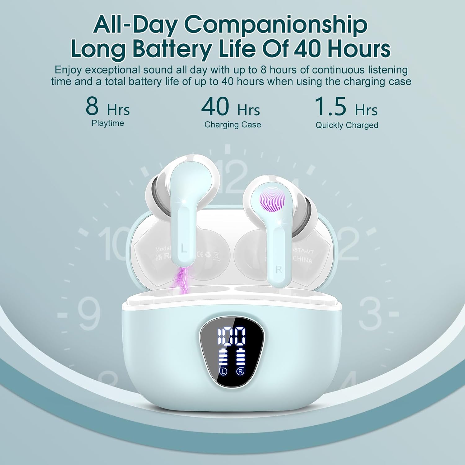 48H long-lasting battery life & dual LED digital display: Up to 8 hours of music playback on a single charge (1.5h only) with the charging box, this in ear headphones offers up to 48H of battery life, ensuring you can use it for a long time without frequent charging.The LED display clearly shows the battery level of the earbuds wireless bluetooth and the charging box, ensuring you always know the remaining power and enjoy an uninterrupted music experience during a long journey or a busy workday.