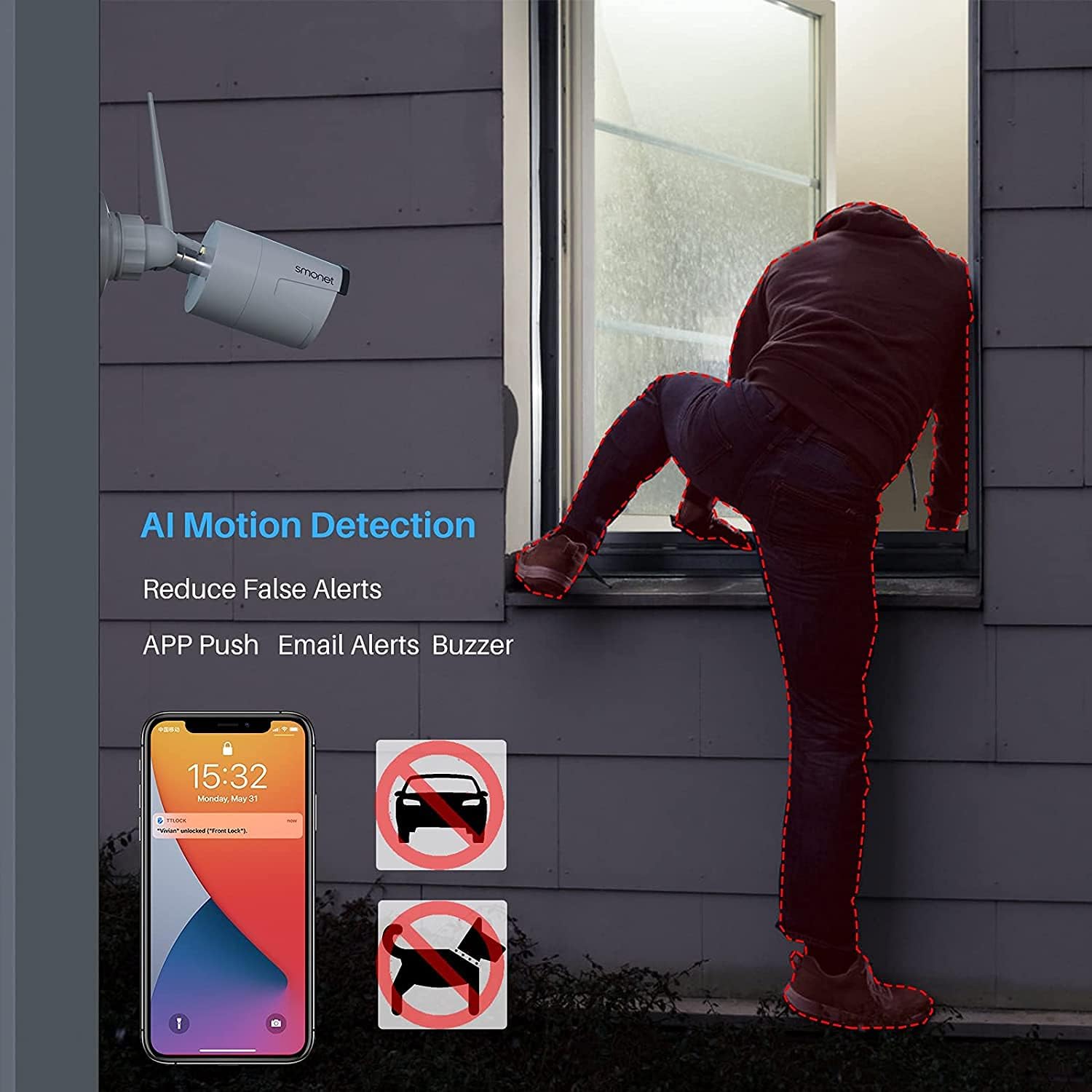 - 【AI Human Detect & Motion Alerts】With advanced recognition algorithms and infrared detectors, once the bullet camera with audio infrared detects that someone is moving, you will receive real-time app push notifications. AI human detection can avoid 99% of false positives of animals or insects(This feature can be manually turned on/off).