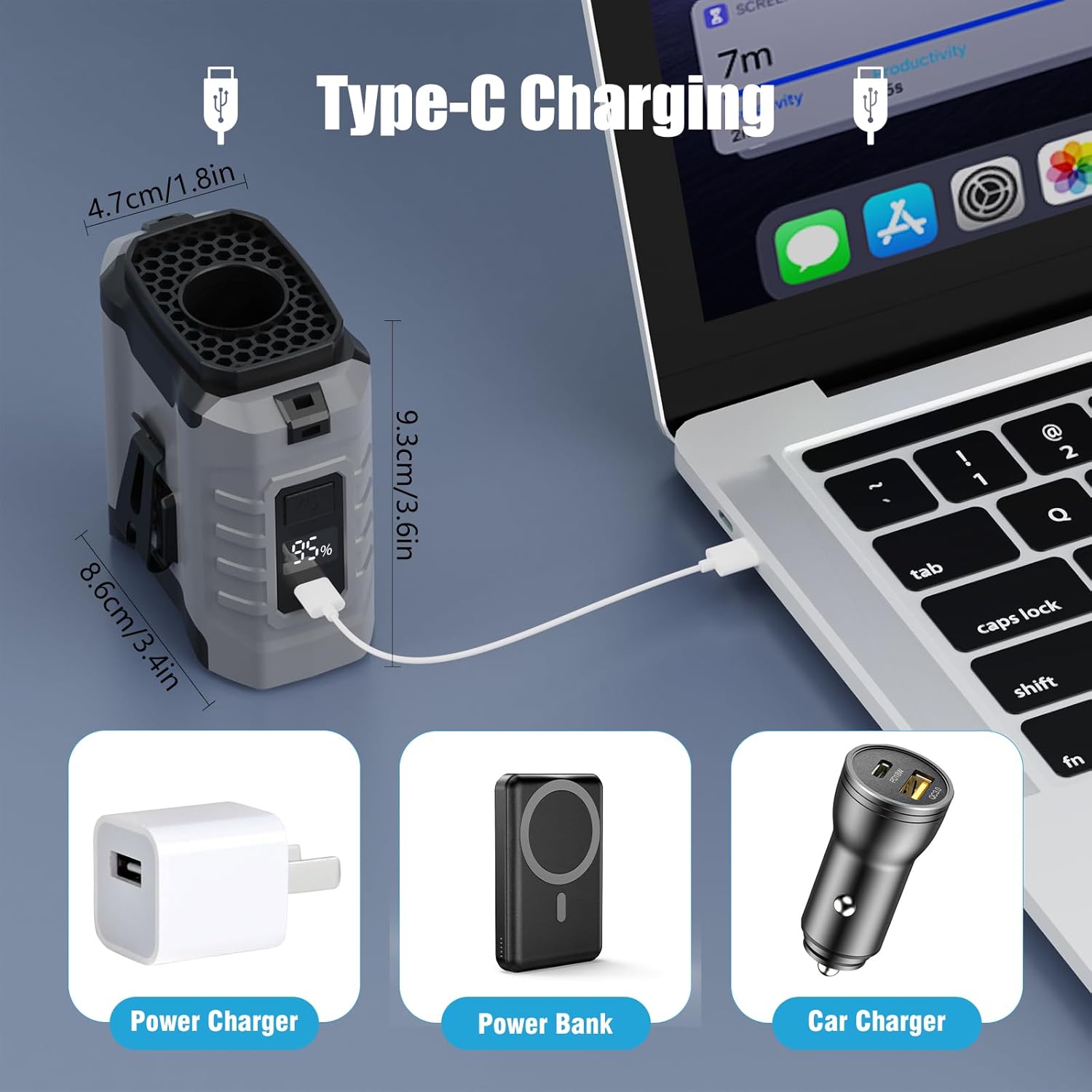 【Long-lasting Working Time】Built-in 10000mAh rechargeable battery, it can run continuously for up to 40 hours at low speed, and it takes 5-6 hours to fully charge. Our portable waist clip fan can be used while charging. Built-in 5V-2A Type-C input, convenient for charging the cordless fan and providing long-lasting cooling anywhere you need it.