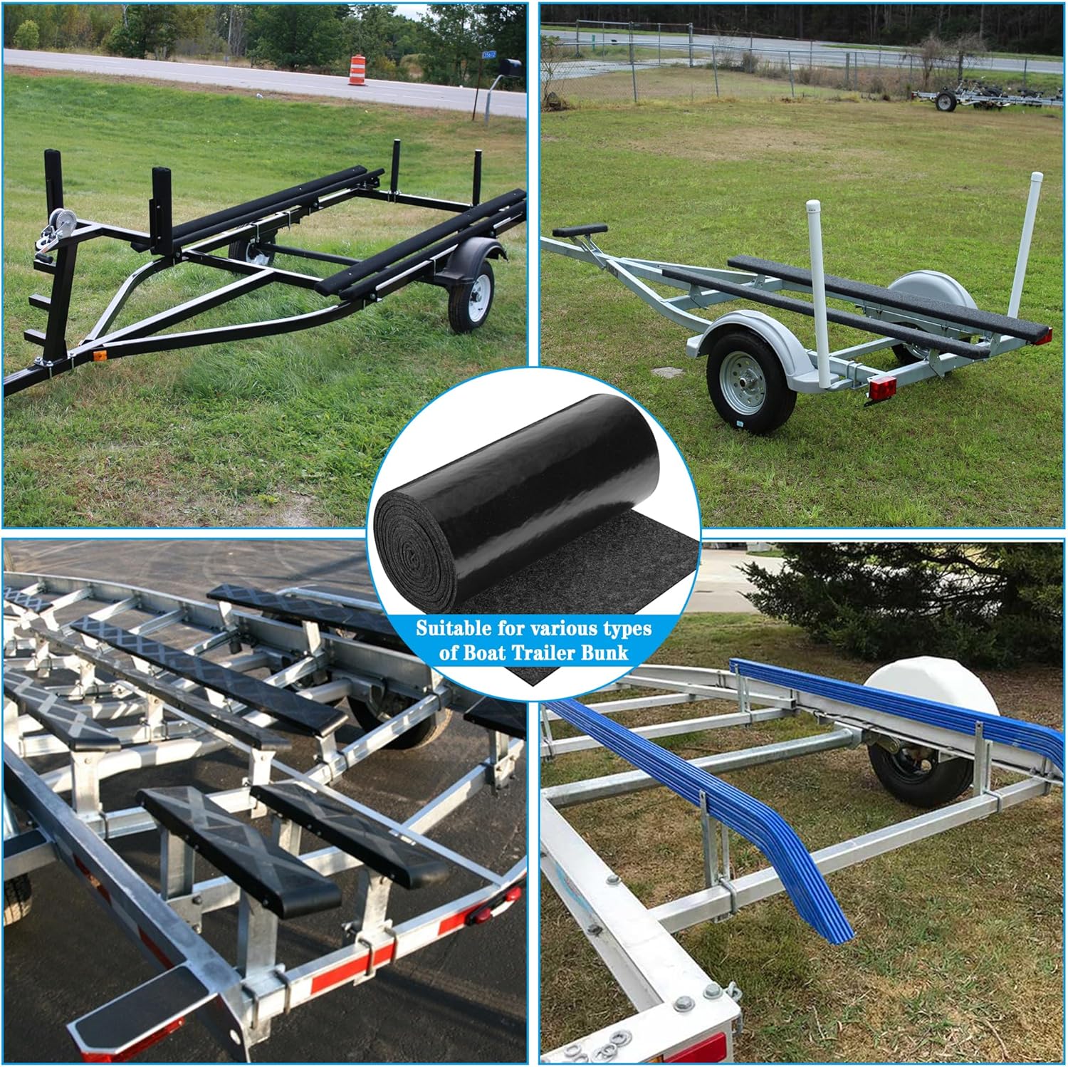 - Large Size: When fully unfolded, this boat trailer bunk carpet is 20 ft long and 12 inch wide, which is long enough to ensure that the end of your bunk is wrapped up. Excess boat trailer pad can be cut out and used as garage rugs, mounted on boat fittings, patio furniture, etc.