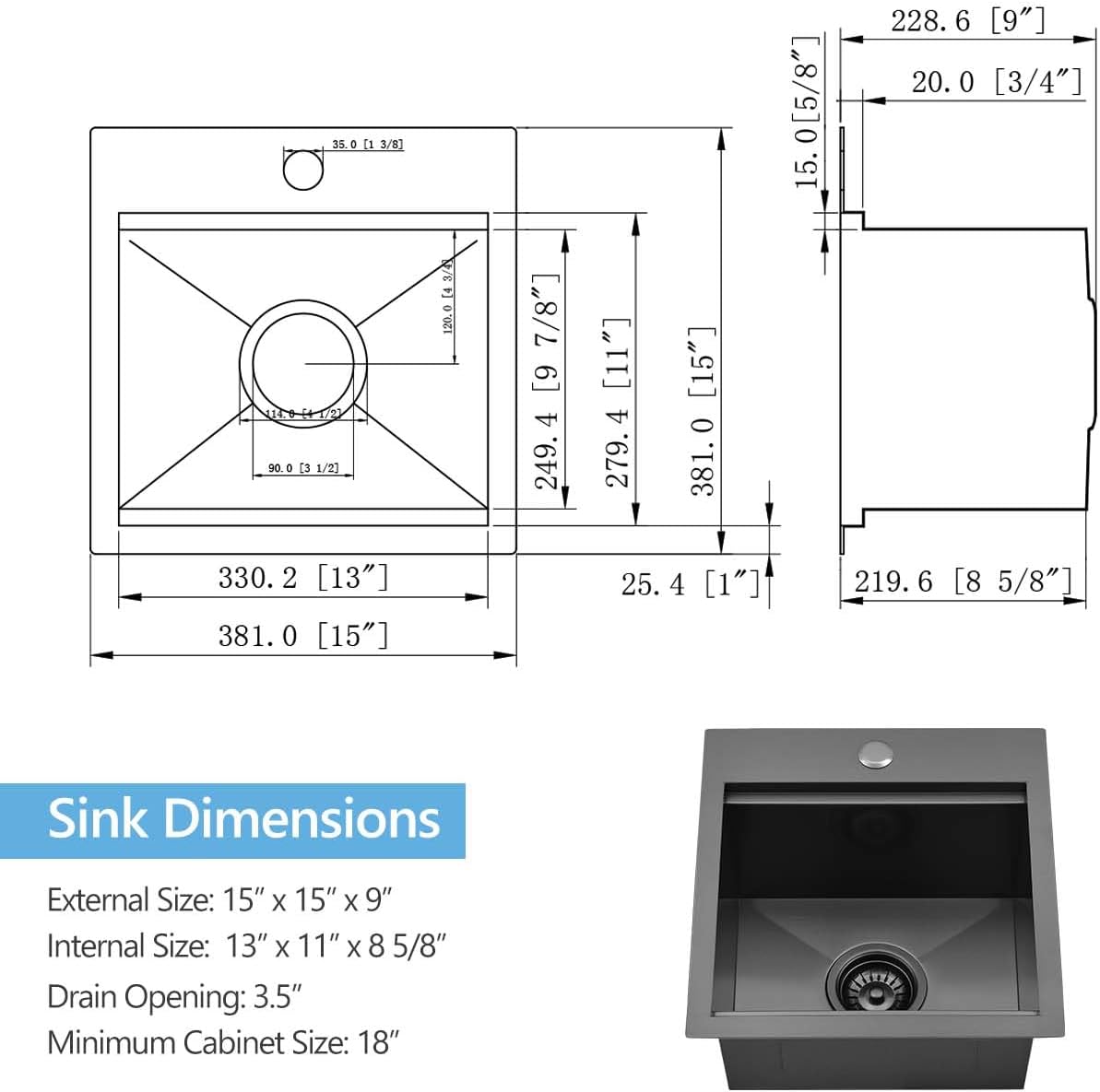 - Sink Dimensions: External size 15"(L)x 15"(W) x 9"(D). Internal size 13"(L)x 11"(W)x 8 5/8"(D). Standard 3.5 inch drain opening. Minimum Cabinet Size: 18". Please make sure your cabinet or garbage disposal can fit this 15”x15” kitchen bar sink before purchase.