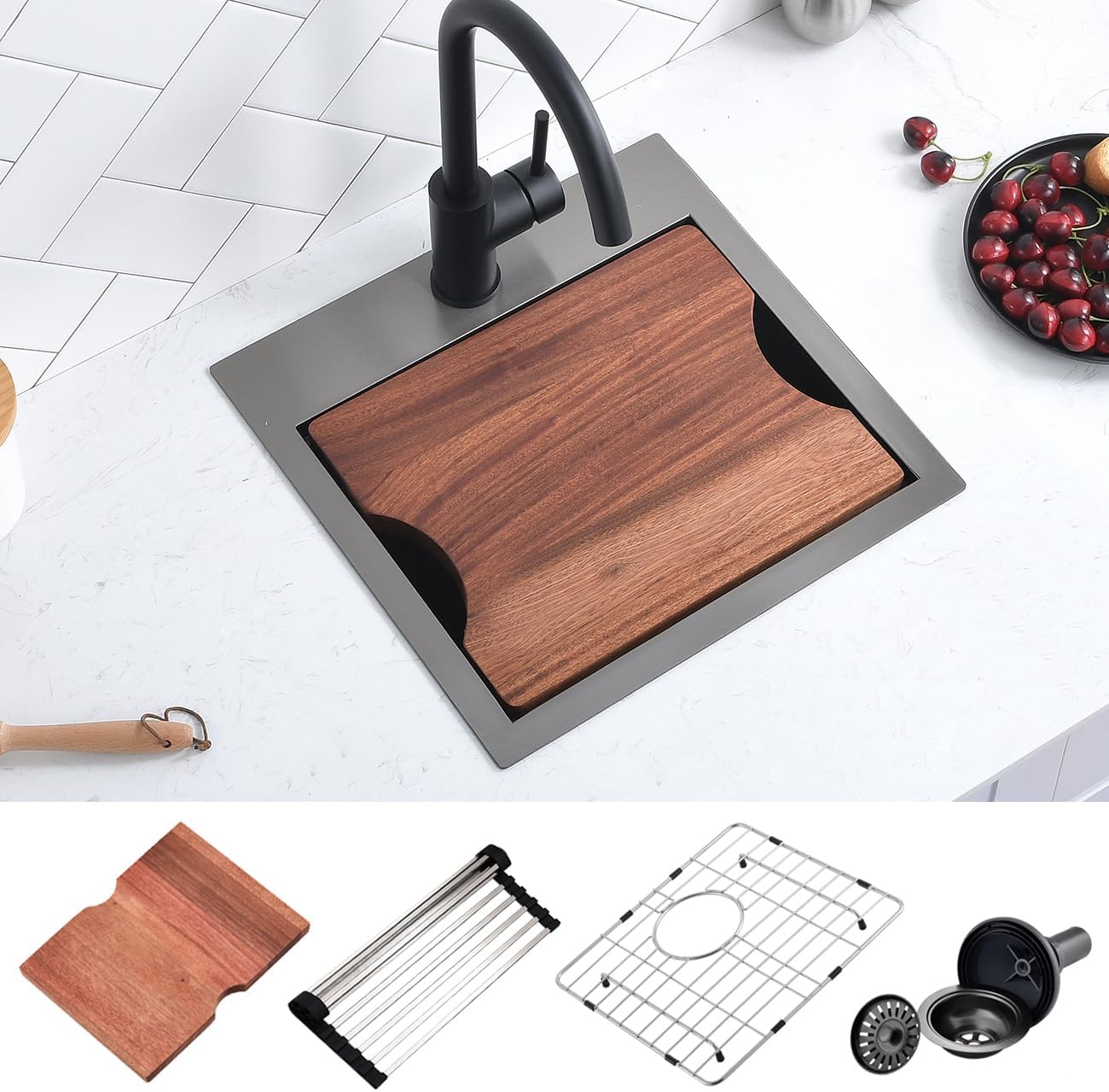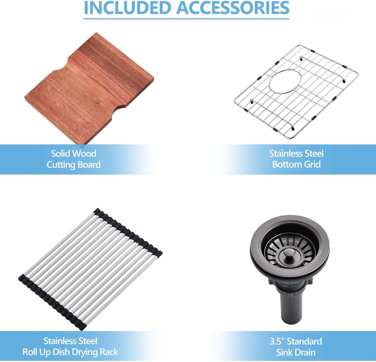 - Workstation Design: a track for for accessories, such as stainless steel roll up dish rack and wood cutting board. The sink can turns into a workstation, helping you prep, serve, and clean up without more workspace on the kitchen counter. This small kitchen sink can work as a secondary sink during busy holiday activities or as a bar sink or outdoor sink for entertainment.