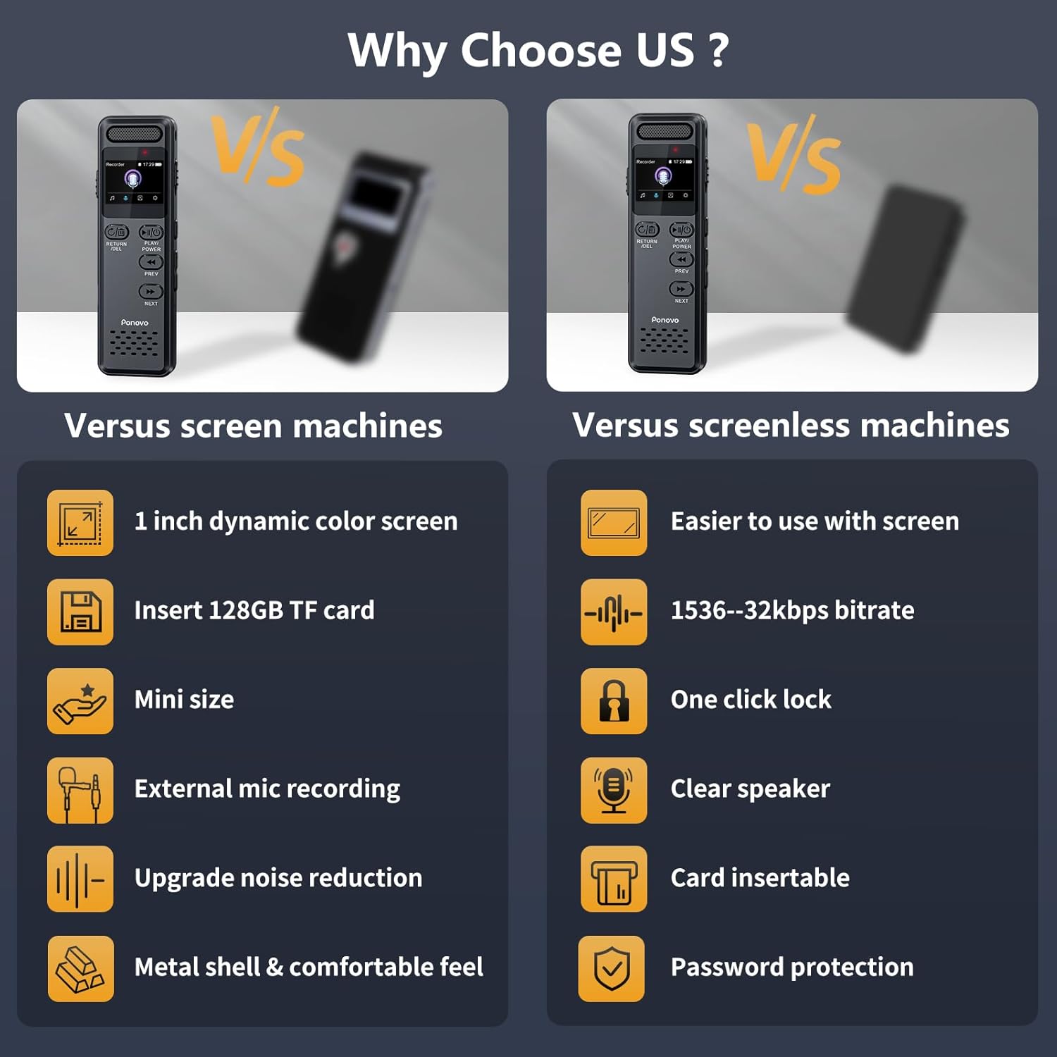 - 【160GB Massive Storage & 10000 Hours Recording Capacity】Ponovo has been specializing in the development of voice recorders for over a decade, dedicated to providing reliable recording devices. This upgraded model offers 160GB storage (32GB built-in + 128GB memory card), and allowing for up to 10,000 hours of audio at 32Kbps. Designed for long-duration recordings, it ensures every lectures, meeting, or interview is fully captured without the need for frequent file deletions or storage concerns