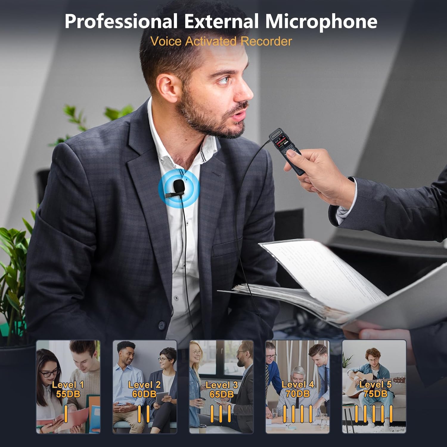 - 【Professional External Microphone & Upgraded Noise Reduction】The external wired microphone can achieve directional sound pickup, accurately capture the target voice (such as interviewees, speakers). It is suitable for scenarios that require high-definition recording, such as journalist interviews, business meetings. The upgraded 2159 noise reduction chip of the voice recorder device can effectively filter unnecessary background noise and provide high-definition recording up to 1536Kbps
