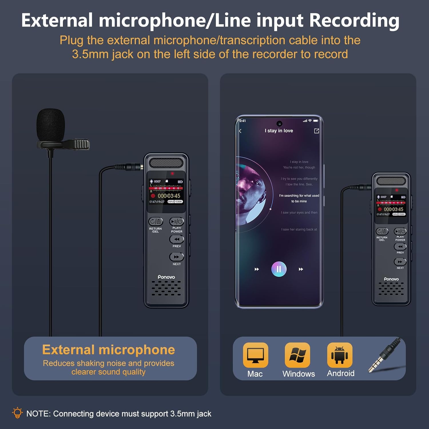 - 【2-Year Warranty & 24-Hour Customer Support】Your satisfaction is our unremitting goal! Ponovo audio recorders with microphone provide a 2-year warranty for all users. Please read the included instructions before use. If you encounter any problems during use, please tell us and our team will give you a instant answer within 24 hours. Pack include:1*160GB Digital Voice Recorder, 1*3.5mm External Microphone, 1*3.5mm Line-in Cable, 1*USB-C Cable, 1*Lanyard, 1*Manual and Quick Help