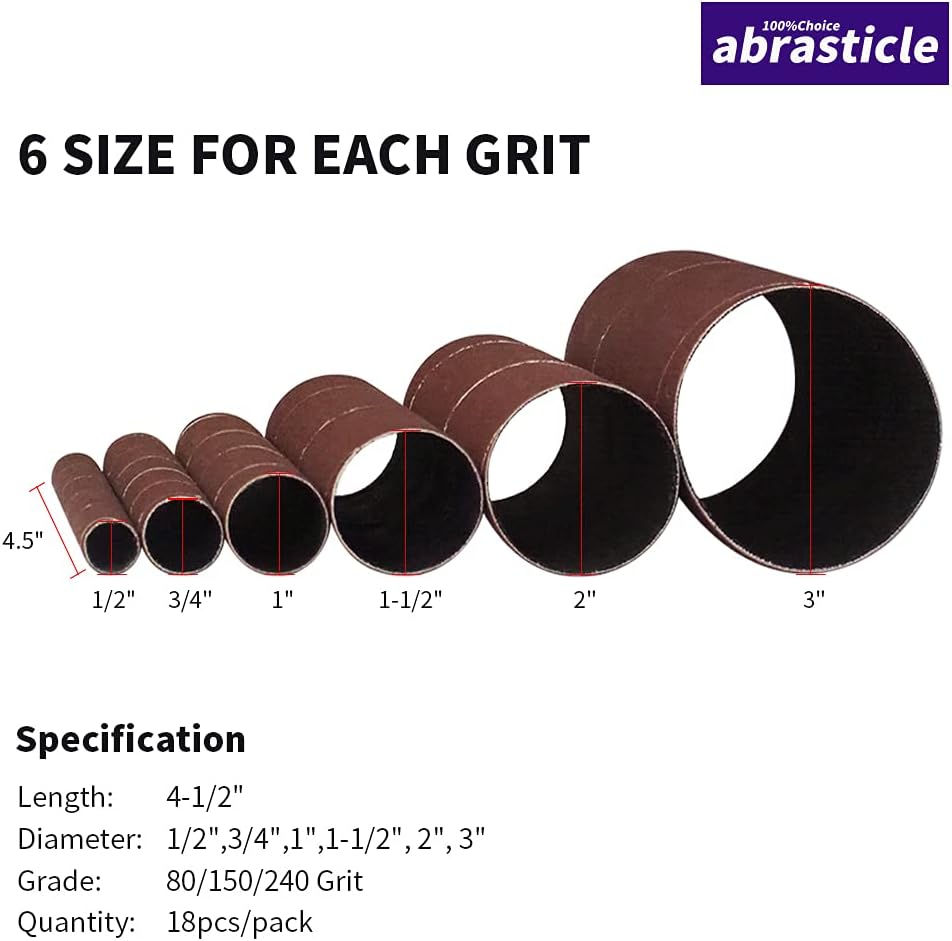 - 18 Pack oscillating spindle sander sleeves - 80 / 150 / 240 grit assorted, 6 Pack per grit - 1/2 inch, 3/4 inch,1 inch, 1-1/2 inch, 2 inch and 3 inch sanding sleeves for each grit, all 4.5" in length