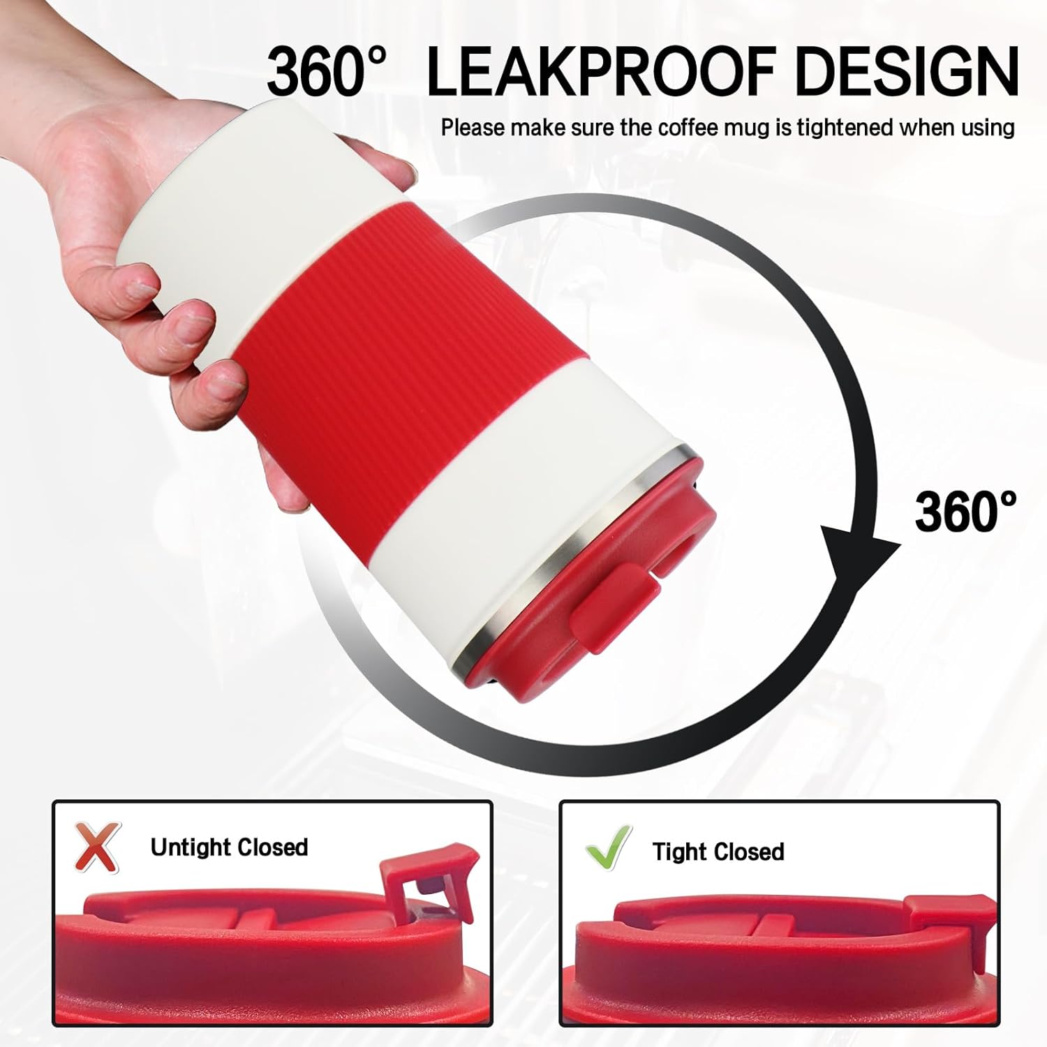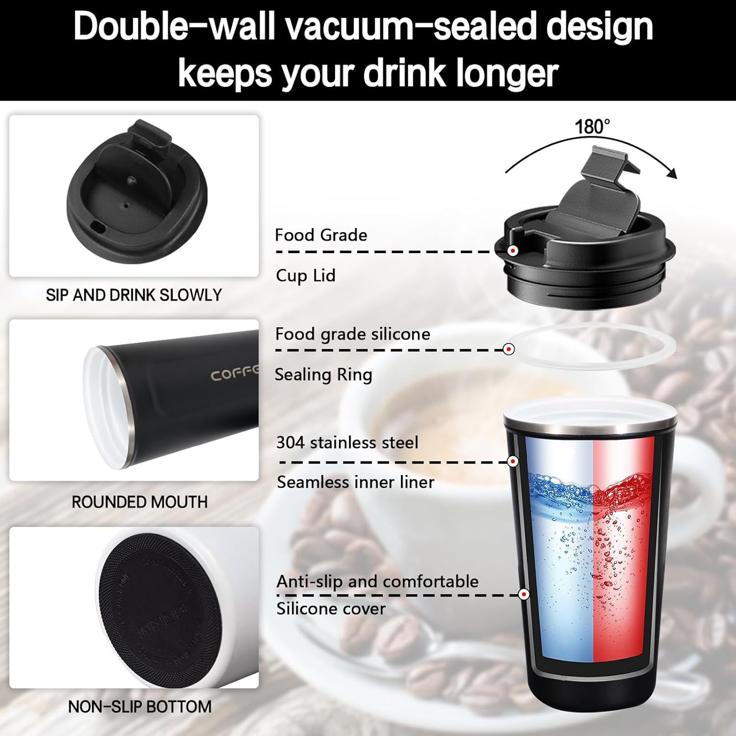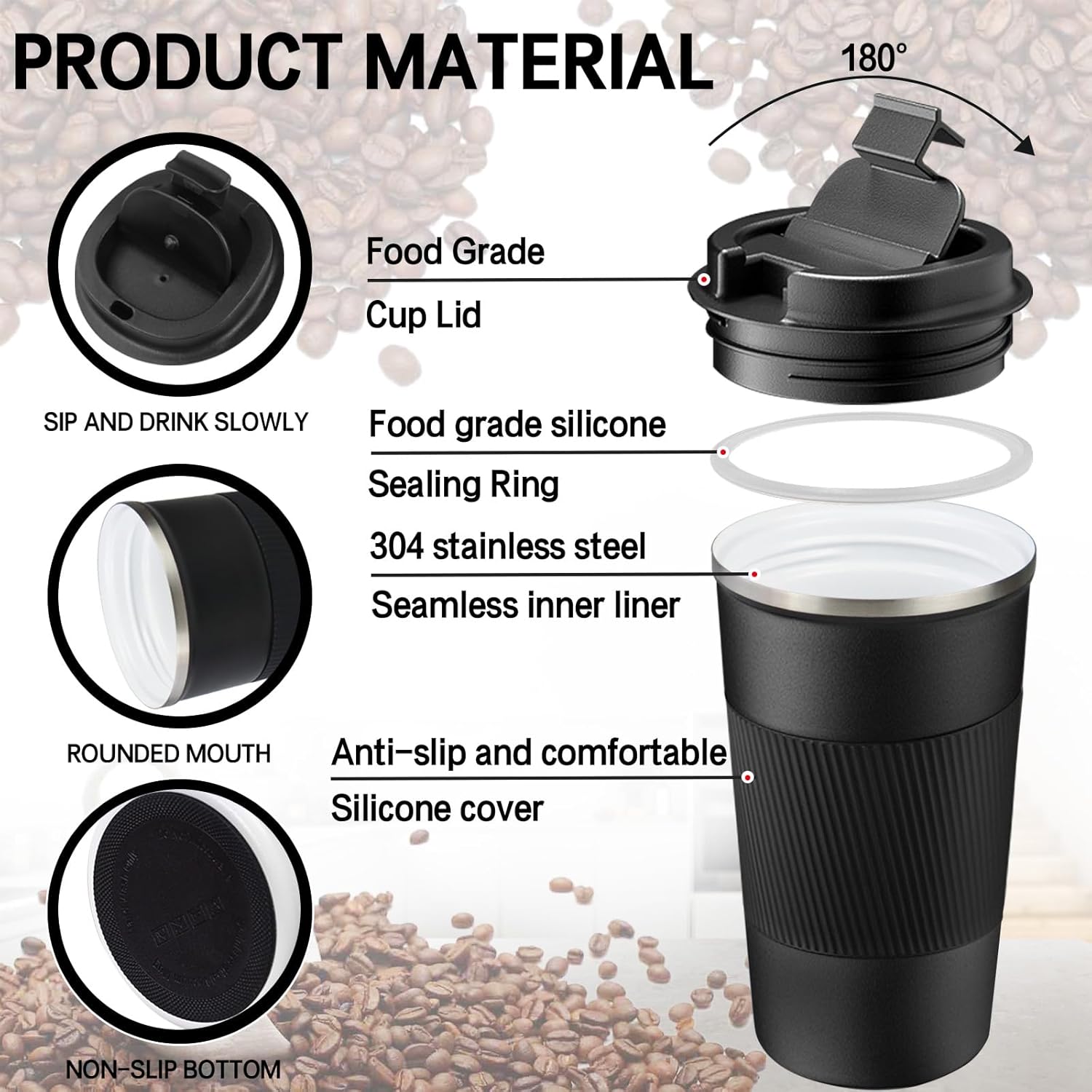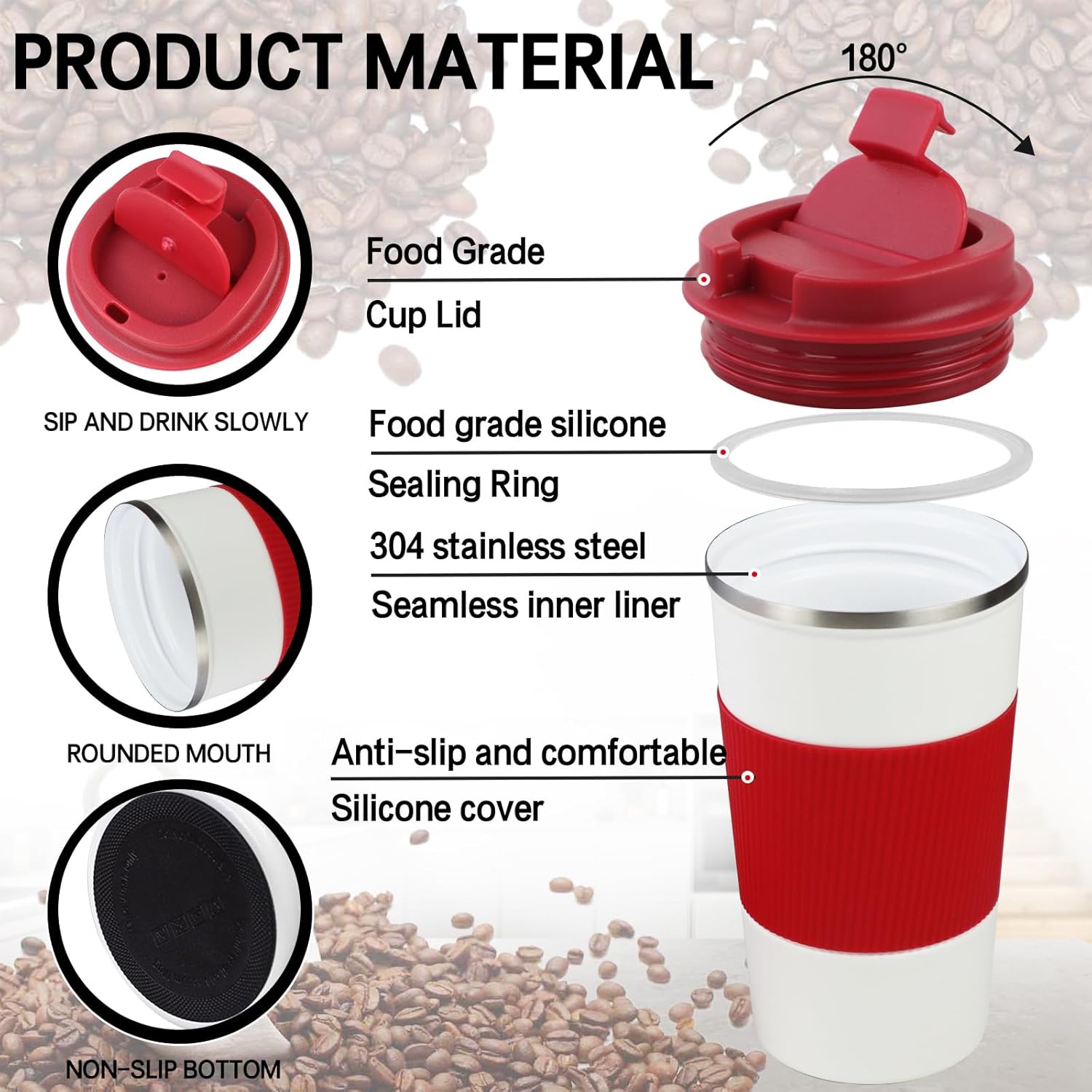 - 【Leak-proof, Non-slip Design】The cover of coffee travel cup has a silicone sealing ring, which has a good leak-proof effect. There is a small opening on the surface of the lid, which can be opened directly to drink and reduce spatter. Coffee cup is also equipped with silicone anti-slip sleeve, comfortable and anti-slip.