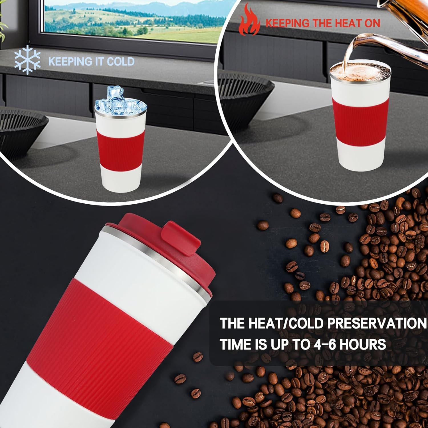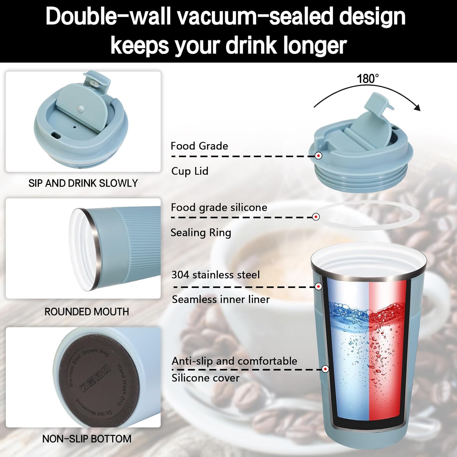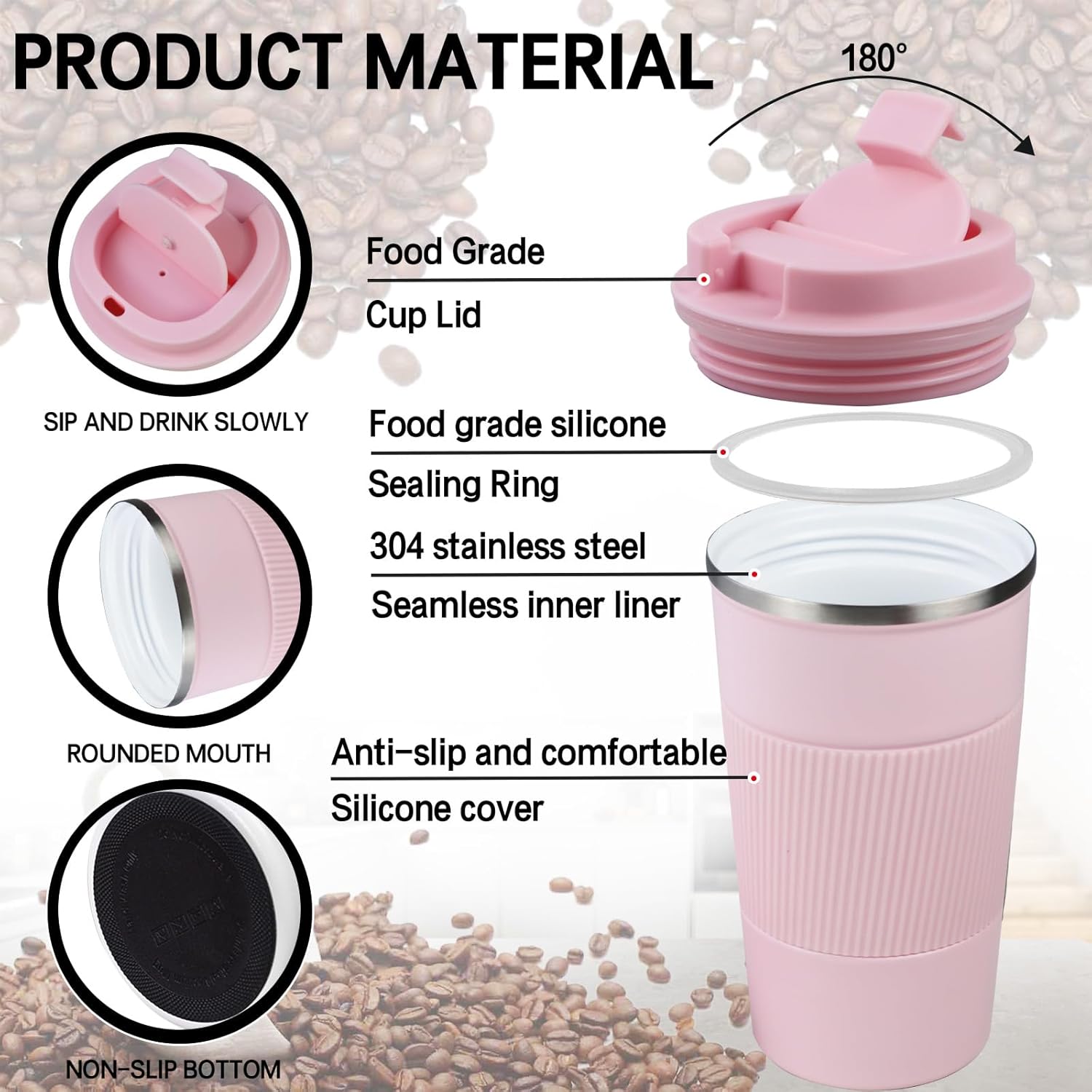 - 【Leak-proof, Non-slip Design】The cover of coffee travel cup has a silicone sealing ring, which has a good leak-proof effect. There is a small opening on the surface of the lid, which can be opened directly to drink and reduce spatter. Coffee cup is also equipped with silicone anti-slip sleeve, comfortable and anti-slip.
