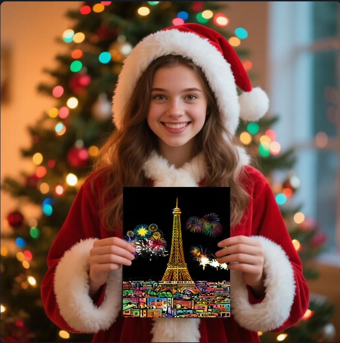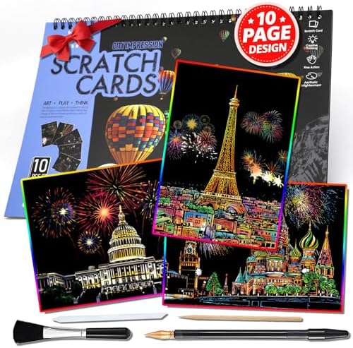 Each black-coated scratchboard conceals a vibrant rainbow-hued landmark. Reveal stunning scenes such as the Eiffel Tower, Taj Mahal, Tower Bridge, Sydney Opera House, Golden Gate Bridge, and more, using the included scratch tool. -
