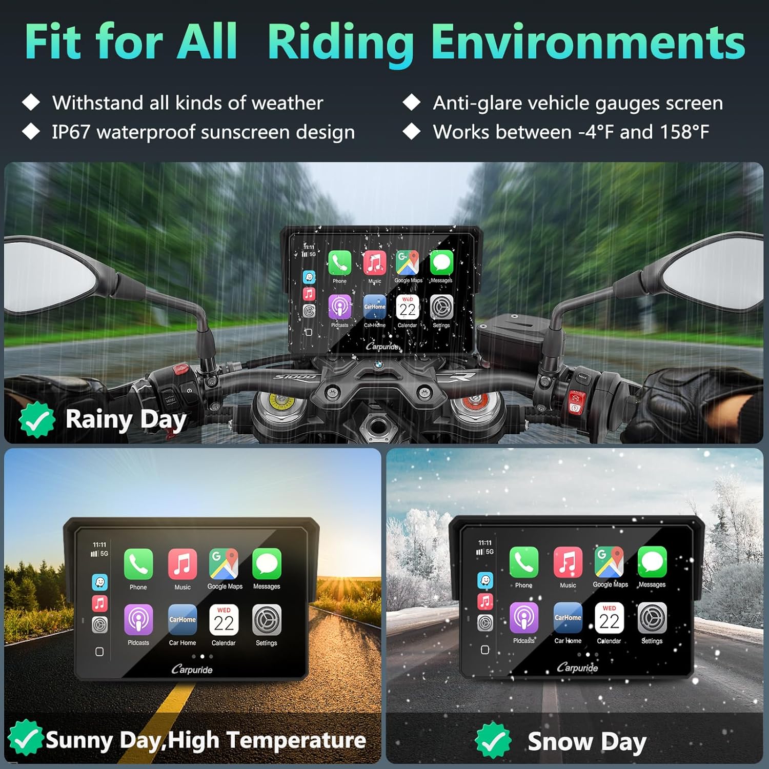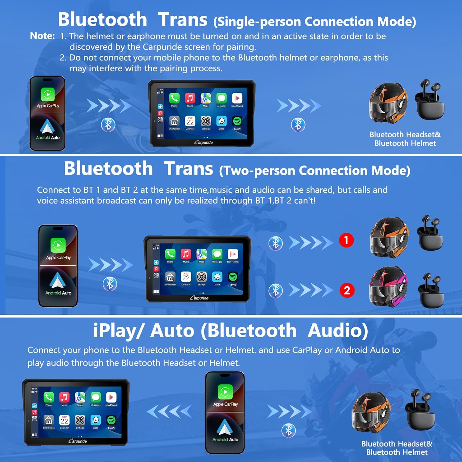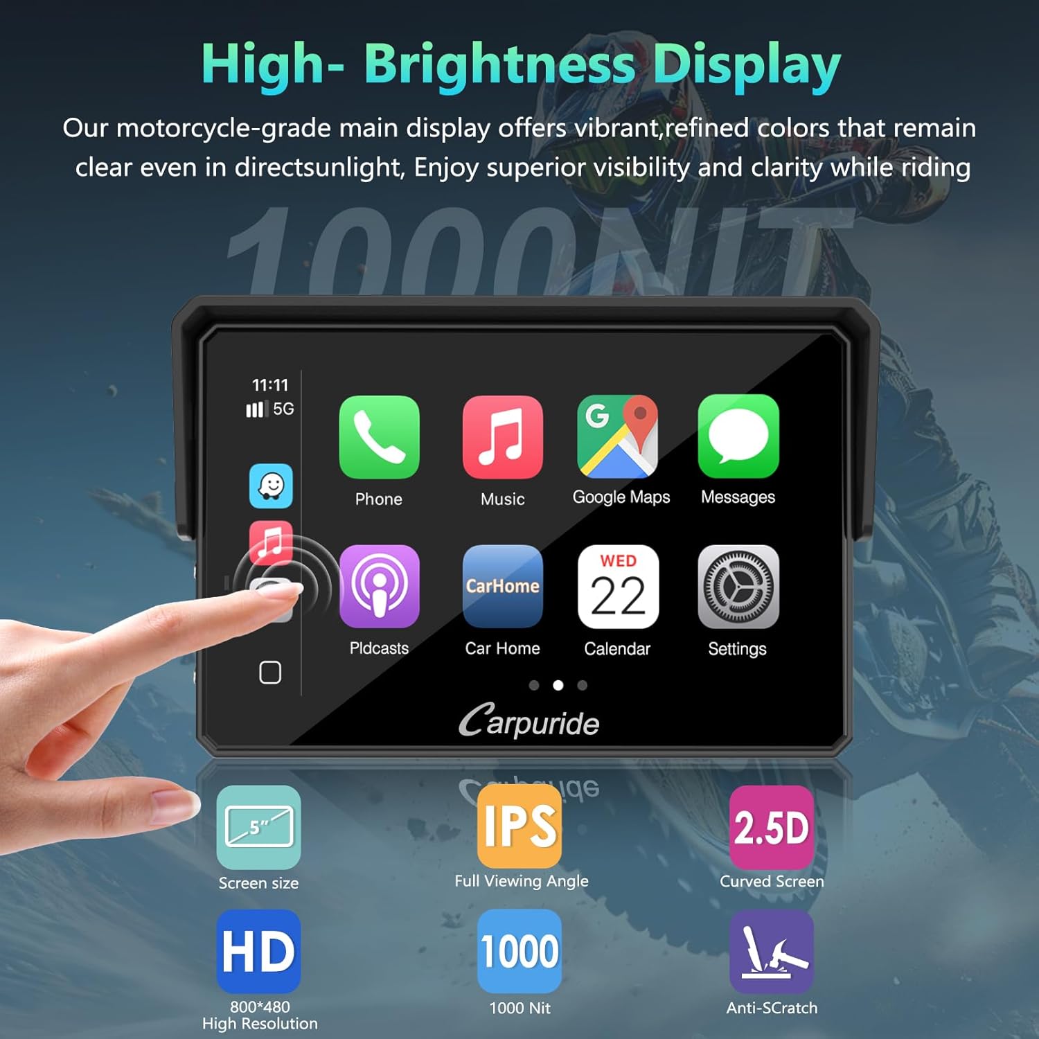 - 【Dual Bluetooth - Audio & Transmission】The Carpuride W702bs pro motorcycle GPS CarPlay features built-in dual Bluetooth connectivity, allowing you to pair the CarPlay touchscreen with your smartphone and Bluetooth-enabled headset or helmet. You can make hands-free calls or enjoy your favorite music without removing your helmet. The convenience of dual Bluetooth seamless connection keeps your phone safely in your pocket while you enjoy a free and easy riding experience.