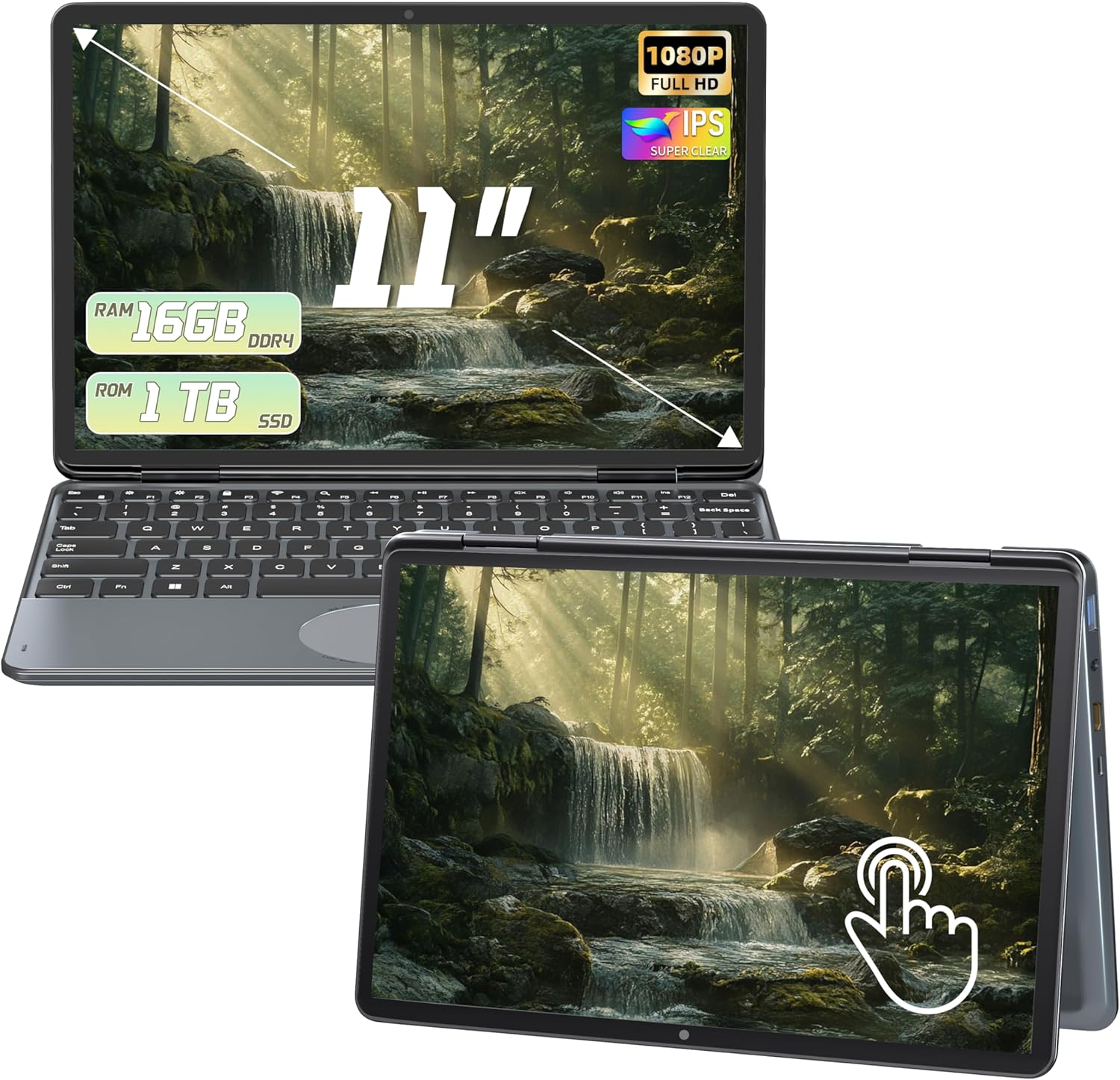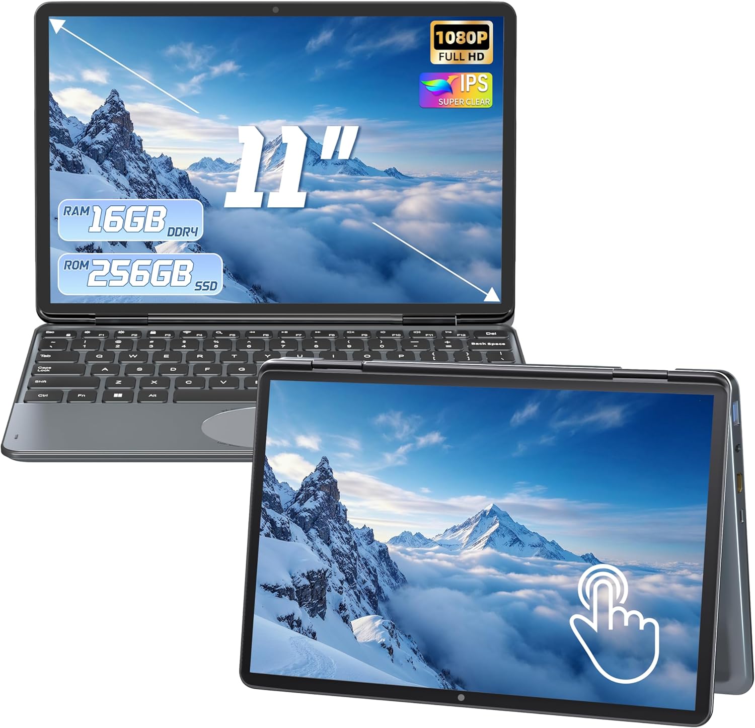 2025 New 2 in 1 Touchscreen Laptop, 11" FHD 1920x1200 IPS Display, Intel 12th Gen N100, 16GB DDR4 RAM, M.2 SSD, 360° Flip, Ultra-Portable Notebook for Students & Professionals (16GB RAM | 256GB SSD)
