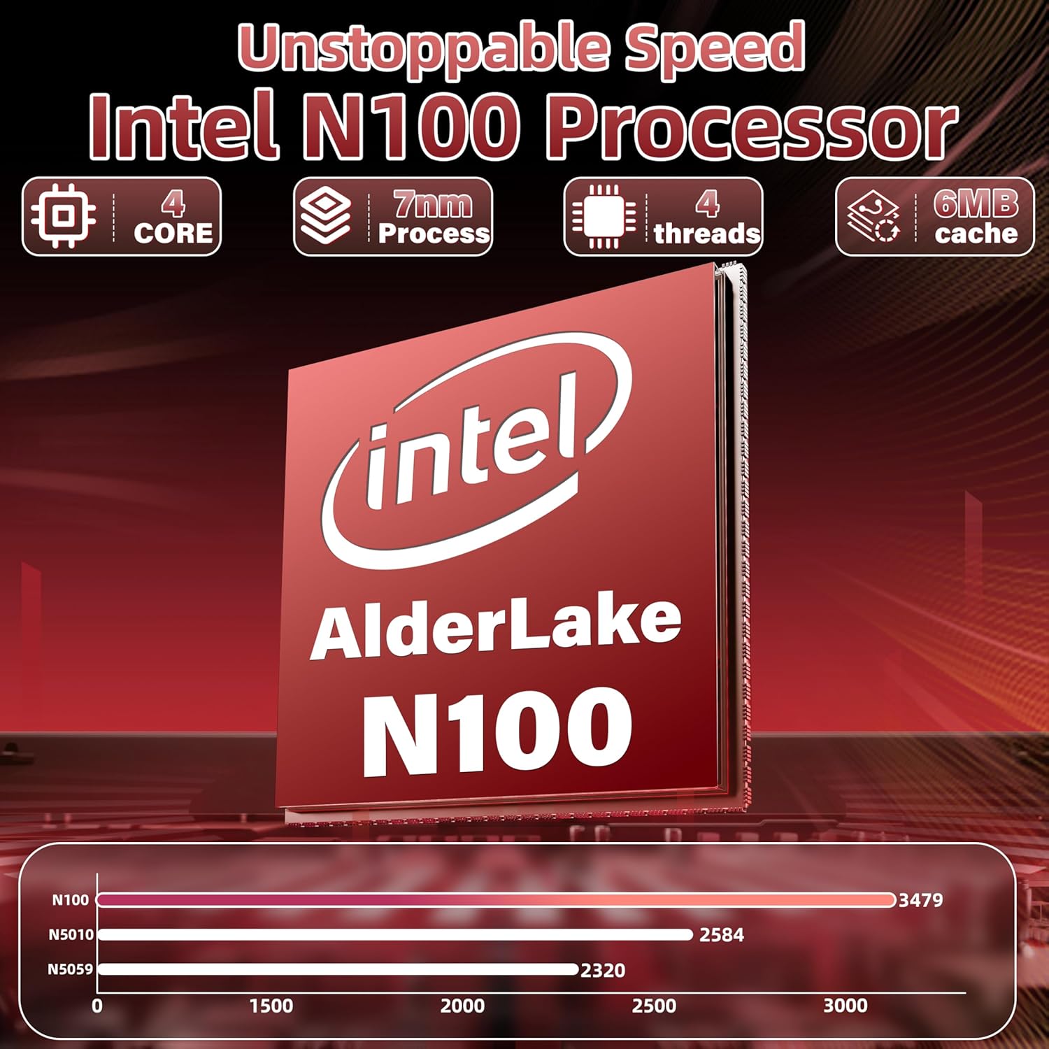- 🚀 [Powerful Intel 12th Gen N100 Processor] Experience efficient performance with the Intel 12th Gen N100 processor, offering burst speeds up to 3.4GHz. The quad-core, 4-thread design ensures smooth multitasking, seamless web browsing, and responsive media consumption, making it ideal for everyday tasks.