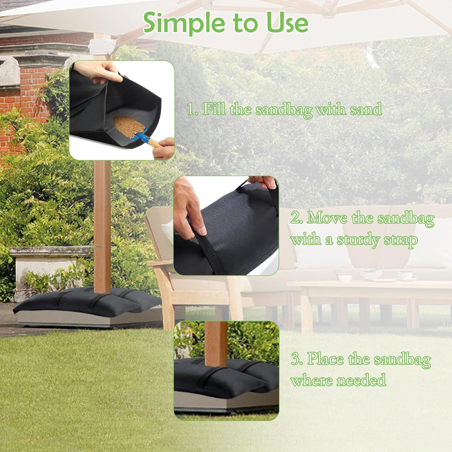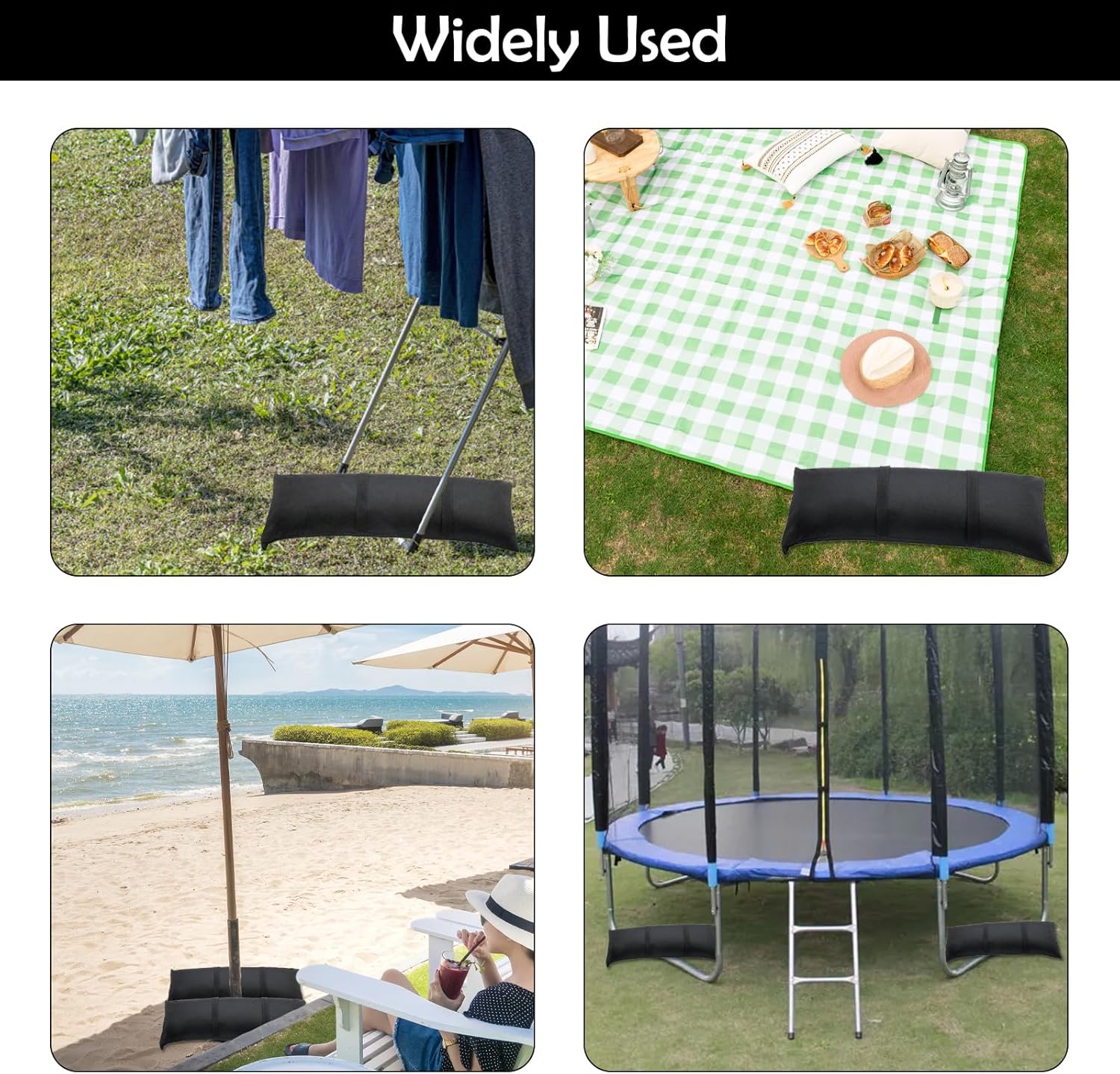 - 【Various Outdoor Uses】Besides being used as umbrella bases, these sandbag weights can be used in countless scenarios: stabilize clothes drying racks, hold down camping gear or use as doorstops. Their neutral black design blends easily into a garden, patio or commercial space. Use them to fix inflatable houses, gazebos or building signs. Empty sandbags can also be used for emergency flood control or DIY projects, which is practical.