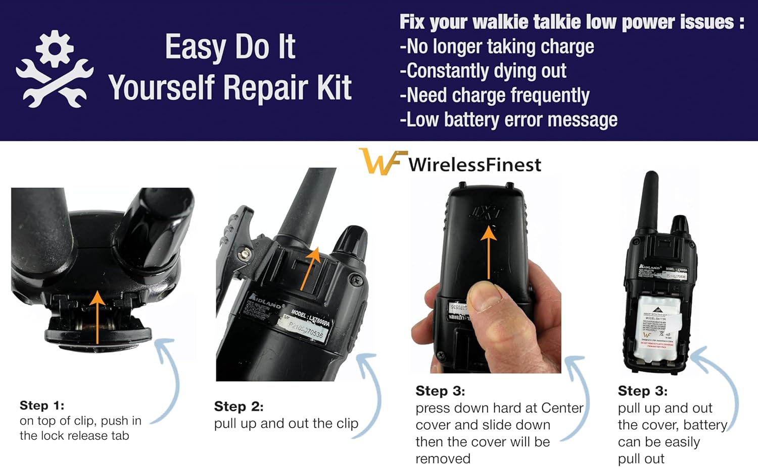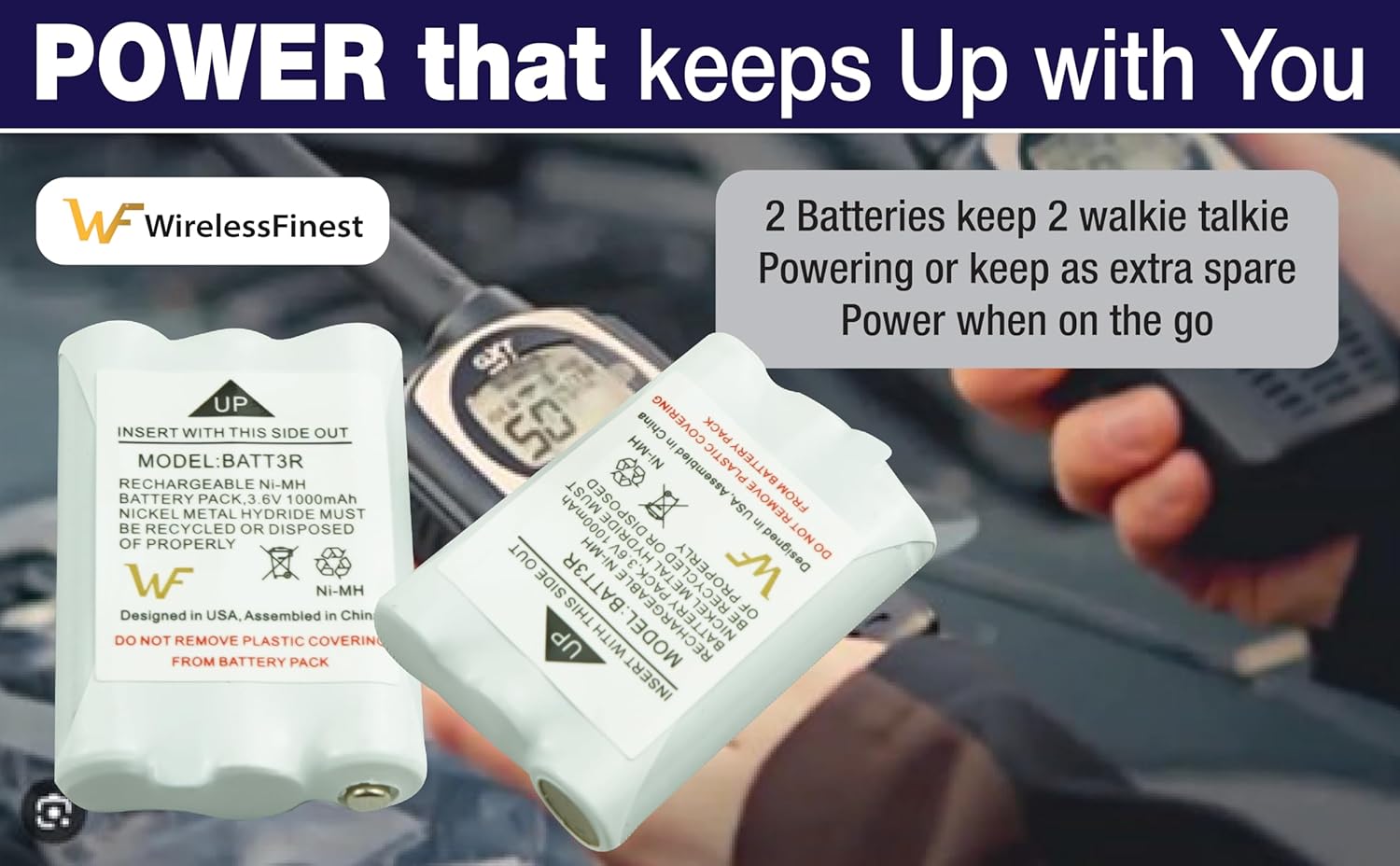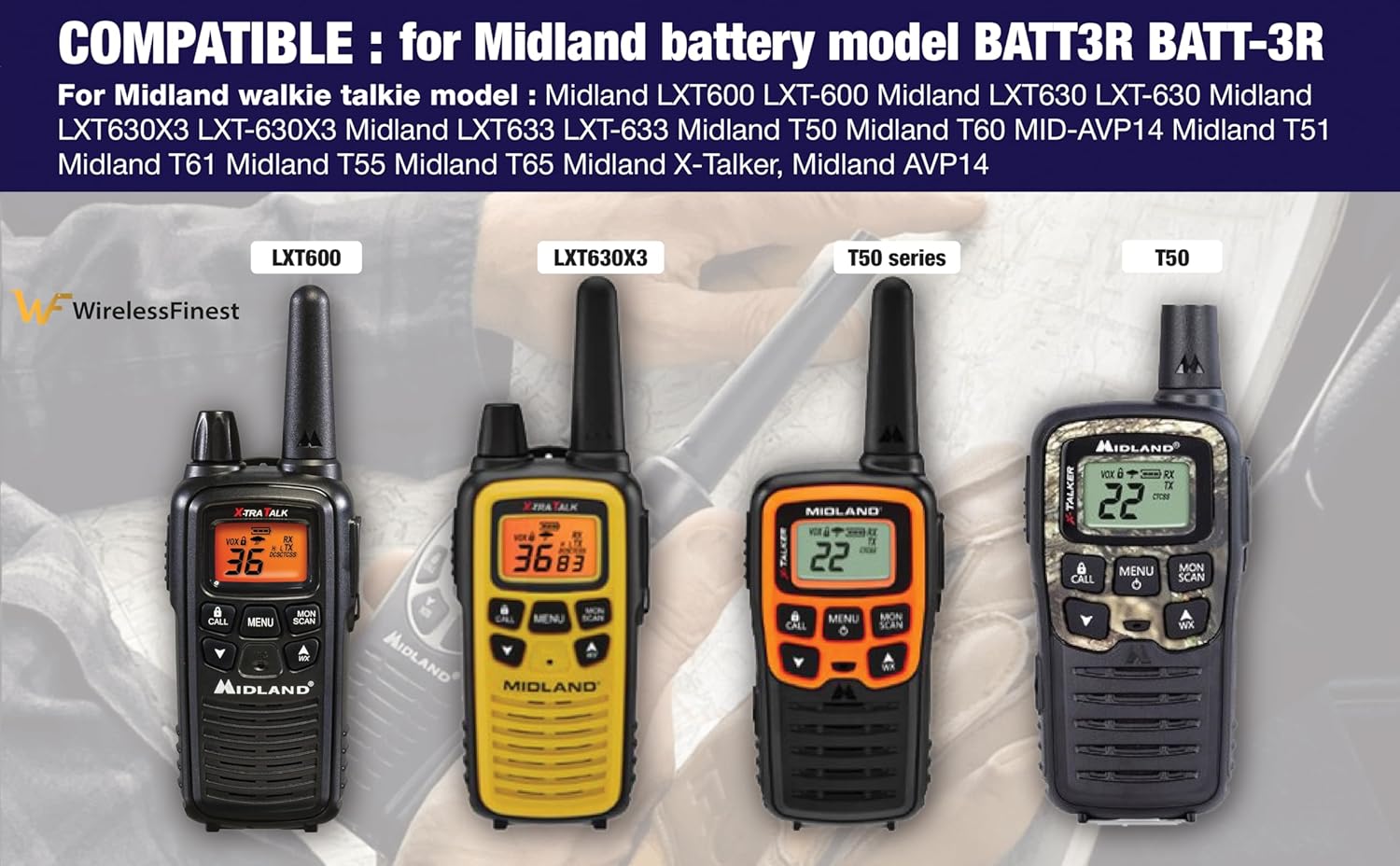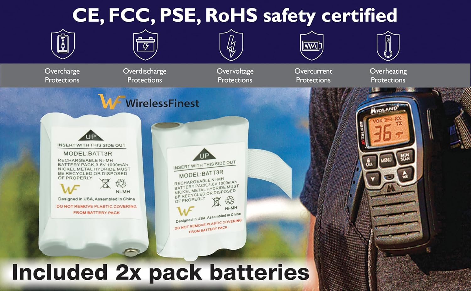 High Capacity: No longer to worry about the endurance of the batteries, our high capacity battery will provide ultra strong power for your devices to performance well and operate longer. Get your set of Midland radio walkie talkies going again, started charging immediately, must have extra replacement WirelessFinest batteries if you are using your walkie talkie every day. GRADE A high quality batteries. Built-in smart chip to prevent over charging, over discharging and overheating protection, short circuit protection, high safety performance, long service life. Meanwhile, WirelessFinest brand batteries are tested under strict quality control standards and certified by CE, FCC, UL, PSE, ROHS. Ensures efficient and safe use. Battery Specification: Battery Type: Ni-MH; Battery Voltage: 3.6V; Battery Capacity: 1000mAh; Battery Dimensions: 44.5 x 30.5 x 10.16mm (1.75" x 1.2" x 0.4"); Package Includes: 2-Pack Battery. For optimal performance, we recommend charging the battery fully before initial use. It will reach peak efficiency after 3-5 full charge cycles. With no memory effect, this battery can be recharged up to an impressive 2000 times even when partially drained, ensuring prolonged usability. For Midland walkie talkie battery rechareable batteries pack compatible for : BATT3R BATT-3R, MID-AVP14, Midland LXT600 LXT-600, Midland LXT630 LXT-630, Midland LXT630X3 LXT-630X3, Midland LXT633 LXT-633, Midland T50, Midland T60, Midland T51, Midland T61, Midland T65, Midland X-Talker.