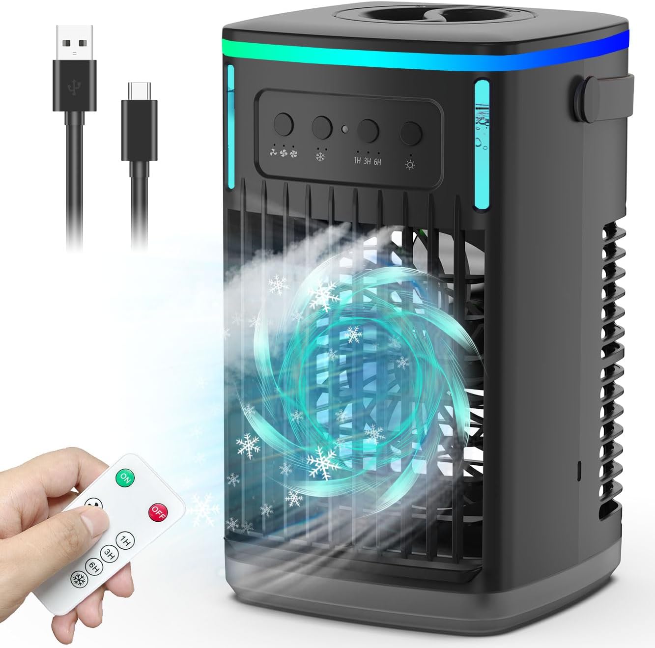 4 in 1 Portable Air Conditioners Fan with Remote,1500ml Water Tank, 3 Wind Speeds, 1-6H Timer, 2 Cool Mist, Personal AC Mini Air Conditioner for Room Bedroom Office Camping (Black)