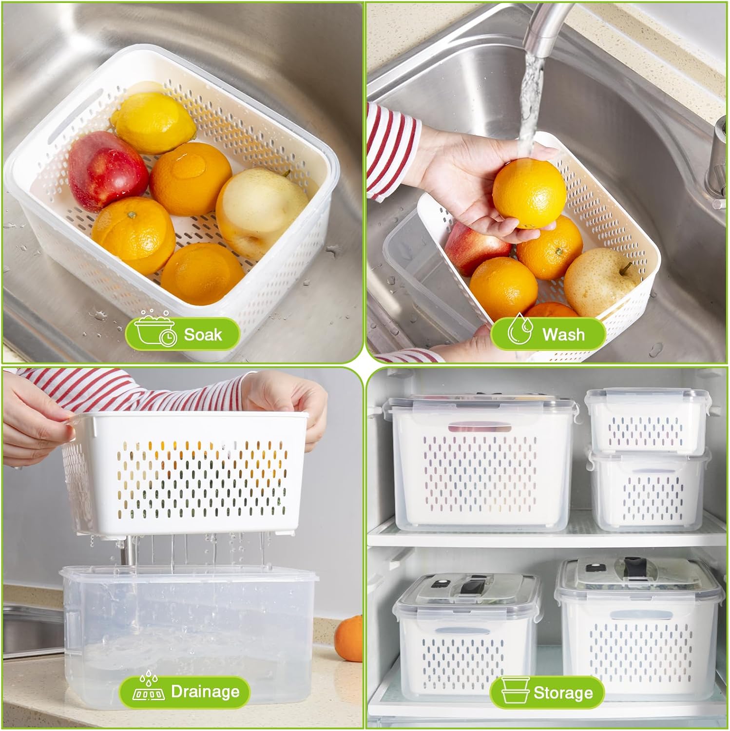 【Keep Produce Fresh Longer】: Compared with ordinary fresh fruit containers for fridge,ours each comes with removable drain, which can effectively separate your fruits or vegetables from water,prevent water accumulation in the container, prevent fruits and vegetables from soaking and rotten.You can also use the colanders to wash your fruits and vegetables.Luxar fresh keeper container fridge each included airtight lid, leak-proof, dust-proof and odor-proof