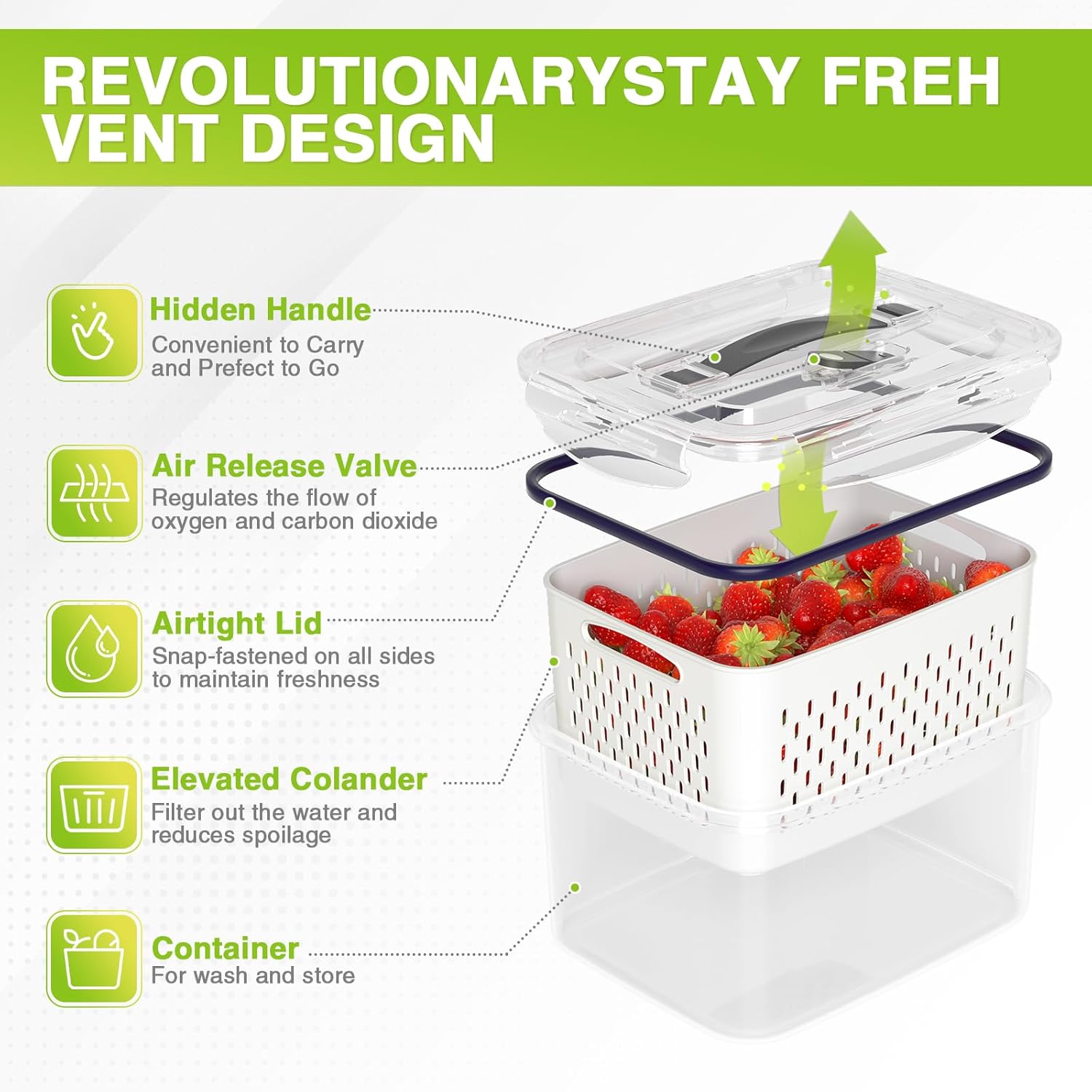 【Multi-Seal Storage Container】: Keep the fresh container set dry,your fresh keeper produce saver can also perfect for storing rice,cereal,nuts, beans, snacks,coffee,and other dry food.This containers for fresh is great gift ideal for your friend, family,You can pretreatment and clean the fruit and berry, your families are able to open the lid to eat fruit or berry anytime and anywhere