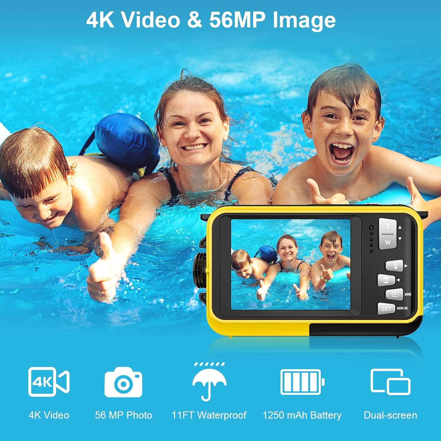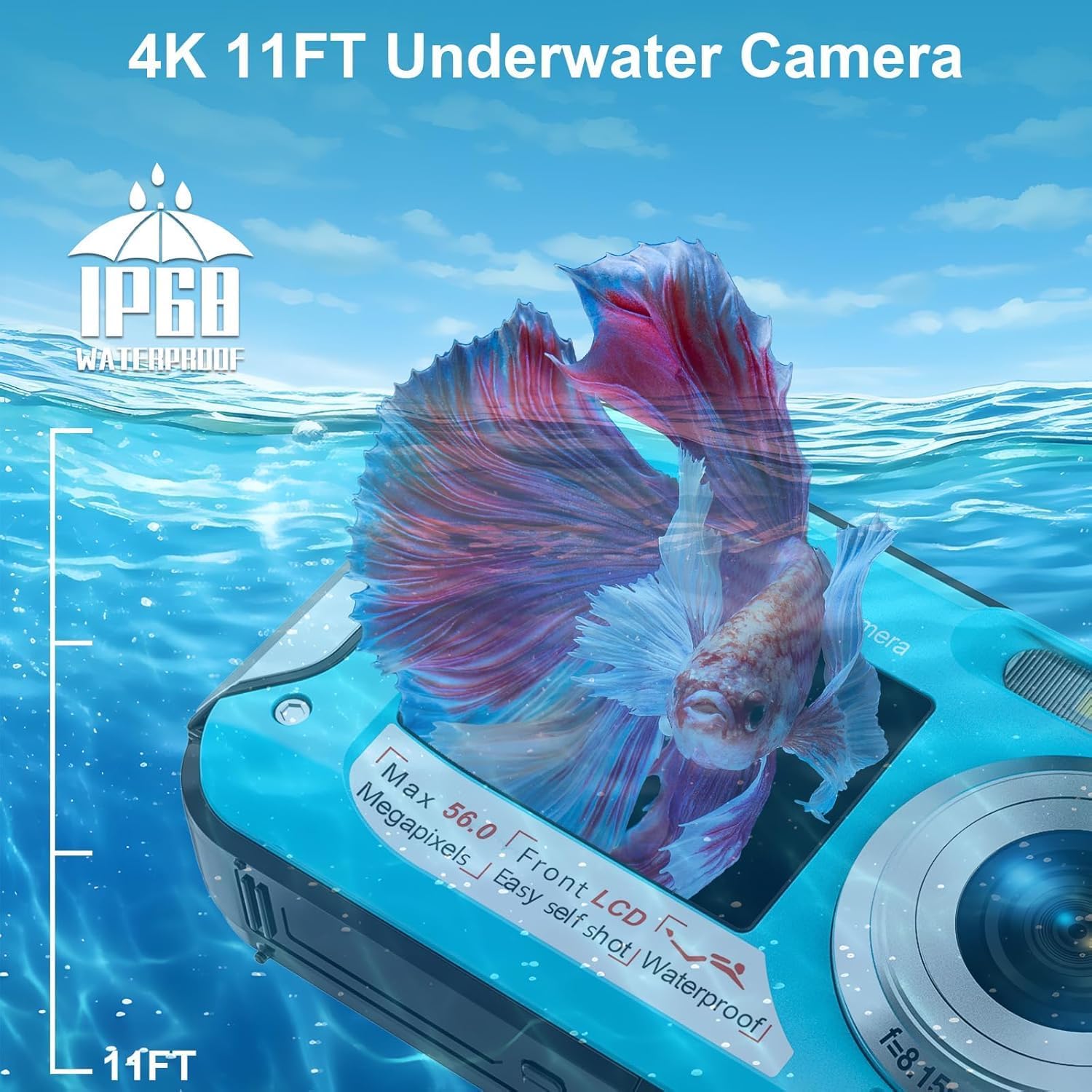 4K Underwater Camera 11FT Waterproof with 32GB Card 56MP Autofocus Selfie Dual-Screen for Snorkeling, Compact Digital Camera 1250mAh Battery (Blue)