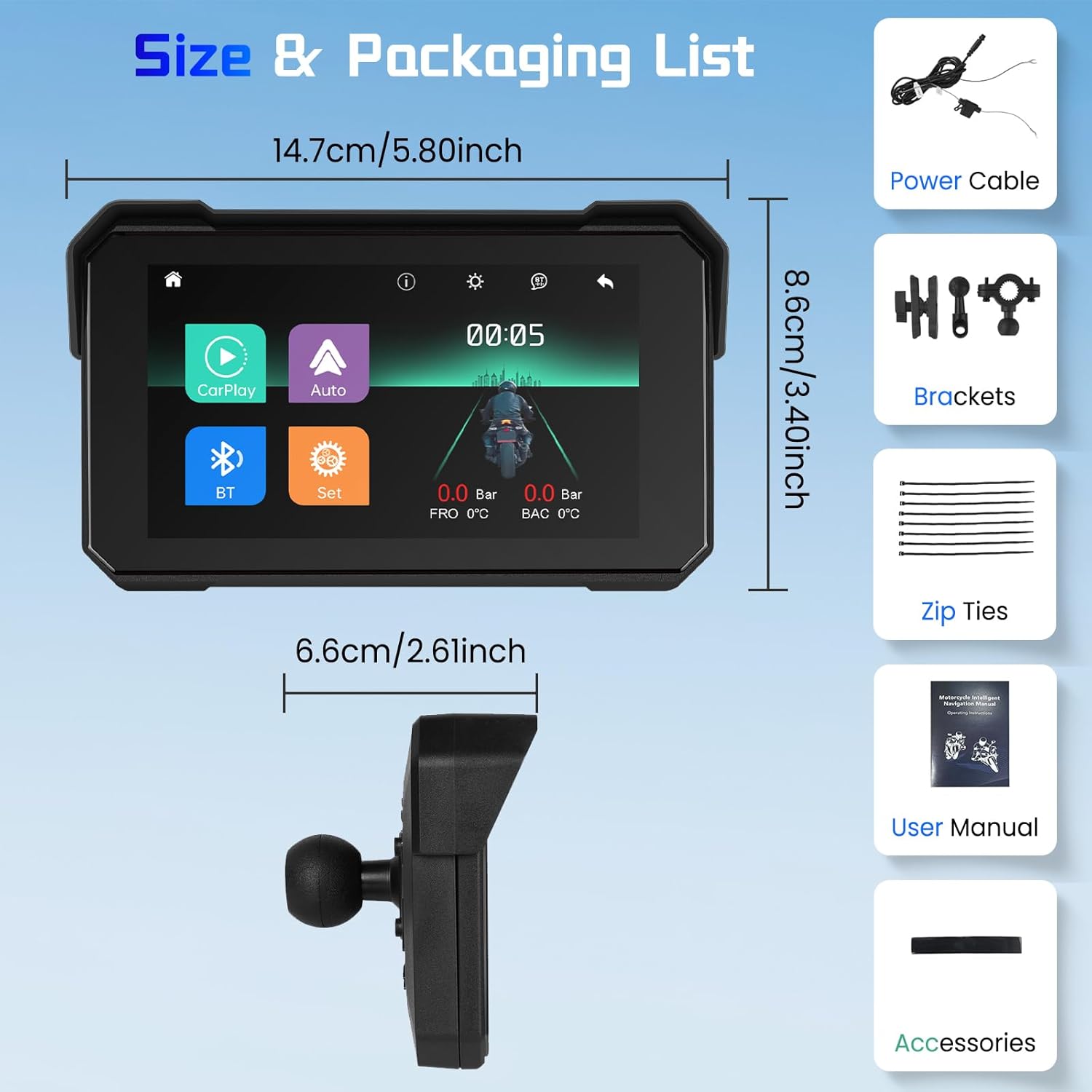 - [Universal Compatibility & Easy Setup] Compatible with most motorcycles, this 5-inch CarPlay screen supports 12v-24v power systems and includes a simple plug-and-play installation. Perfect for touring, commuting, or off-road adventures, it’s your all-in-one solution for navigation, entertainment, and safer riding."