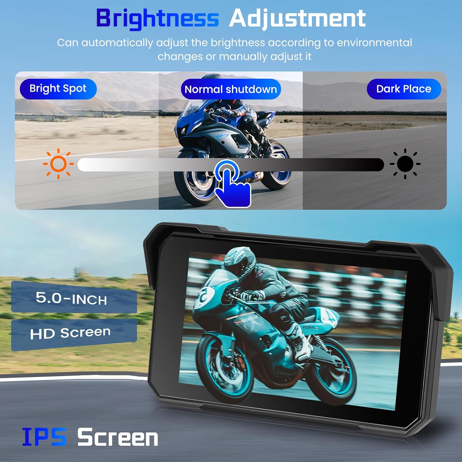 - [Manual-Dimming HD Display & Adjustable Mount]The 5-inch high-resolution screen manually adjusts brightness based on ambient light, reducing glare day or night. Manual brightness control lets you fine-tune visibility, while the 360° adjustable mount ensures perfect viewing angles on any motorcycle dashboard.