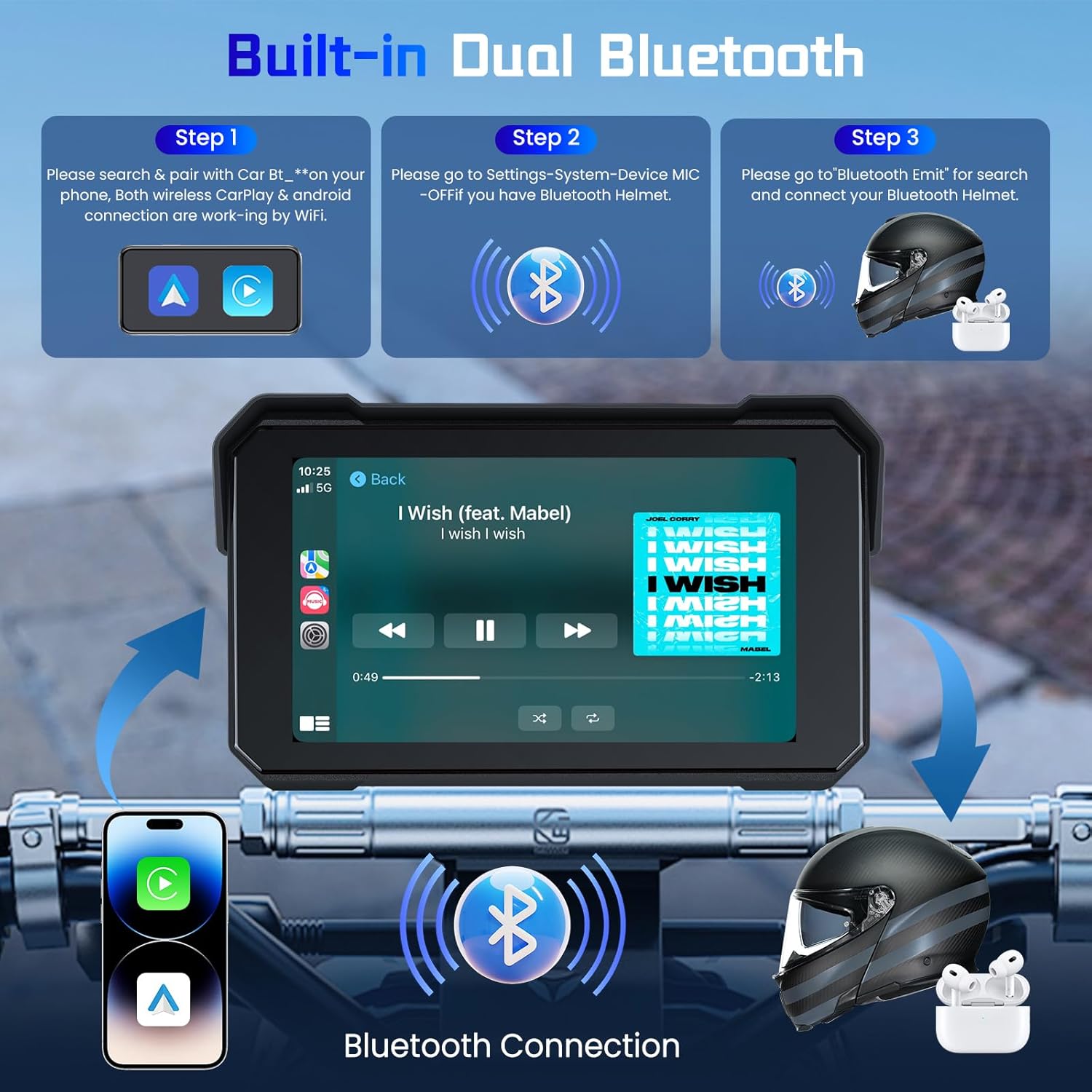 - [Built-in Bluetooth] The GPS carplay for motorcycle comes with integrated Bluetooth connectivity, allowing you to pair your car play screen with your smartphone,Then connecting your mobile phone to the Bluetooth helmet,This setup allows for hands-free calling and listening to your favorite music without removing your helmet.