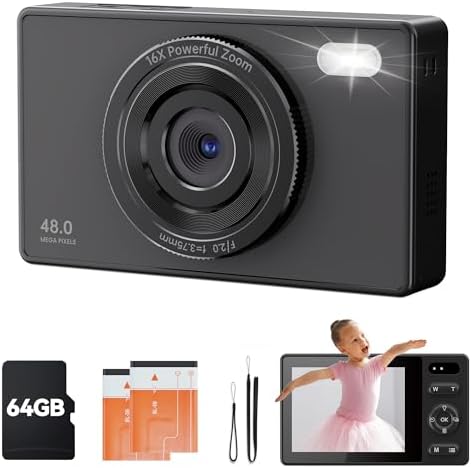 64GB Digital Camera for Kids Photography: 48MP Mini Camera Anti Shake 1080P Video Camera Autofocus 16X Zoom Anti Shake Point and Shoot Camera 2 Batteries Gift for Kid Student Beginner Black