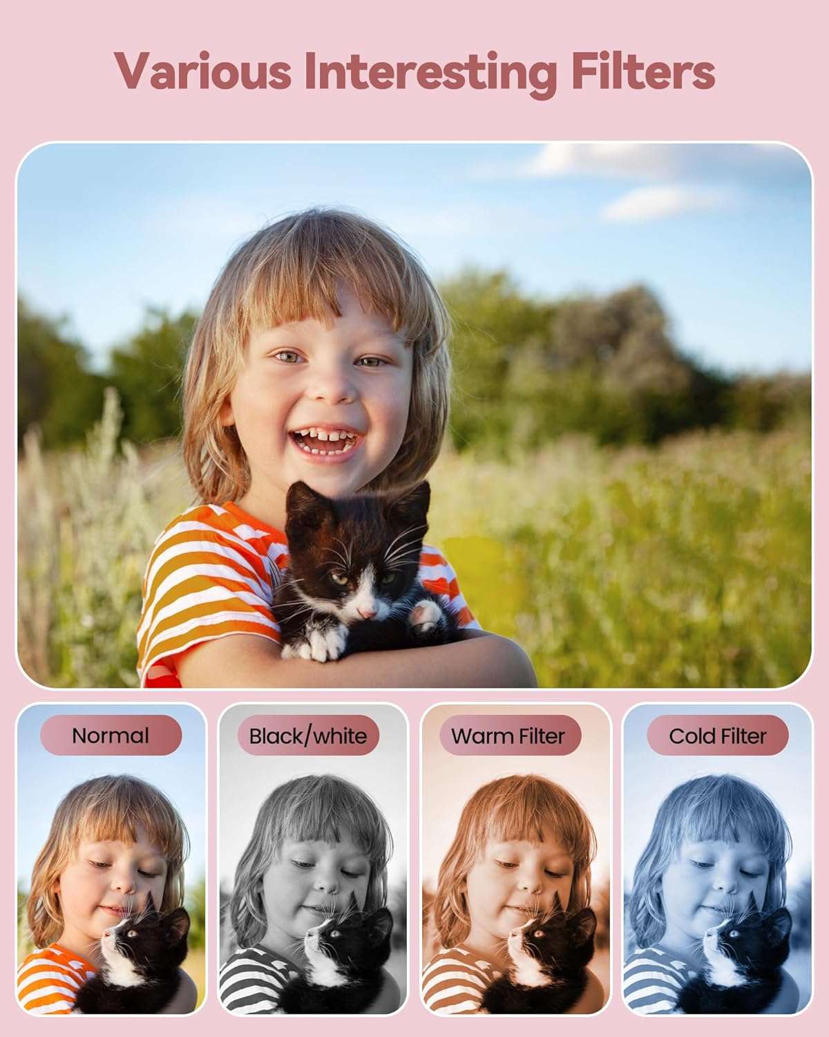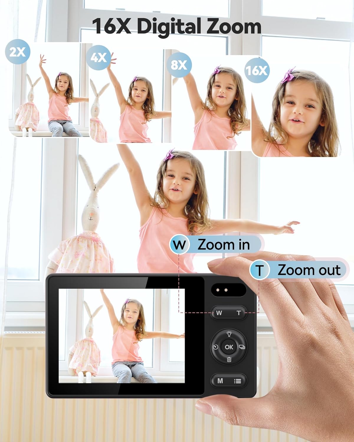 - 【Versatility & Fun】Stimulate interest! Learn new skills more easily! This digital camera is equipped with many fun and simple functions. Such as 16 X zoom, a variety of filters, self-timer, continuous shooting, beauty face, smiley face detection and other functions. These features are perfect to satisfy kids' curiosity and creativity, allowing them to master a new skill-photography in an entertaining way. Users can also connect the digital camera to a computer via USB cable and use it as a webcam to broadcast live on social media platforms.