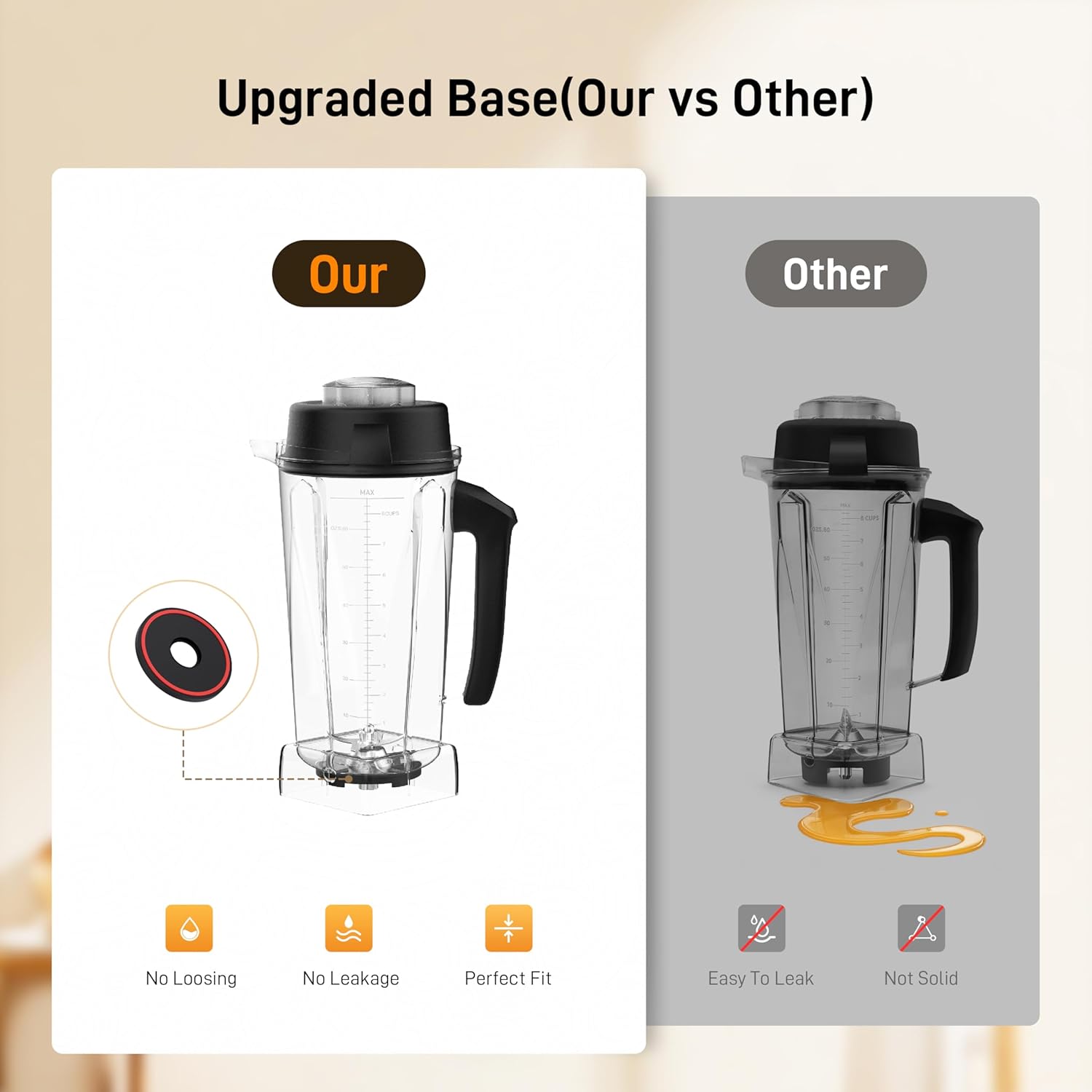 - Upgrade Safety Material: Upgraded container blender is made from BPA-free, food-grade PP plastic, ensuring food safety even working in high temperatures. For vitamix blender cup upgraded to a silent base which made of stainless steel in the center and the around is made of zinc alloy, provide a better sealing, greatly reducing noise during operation
