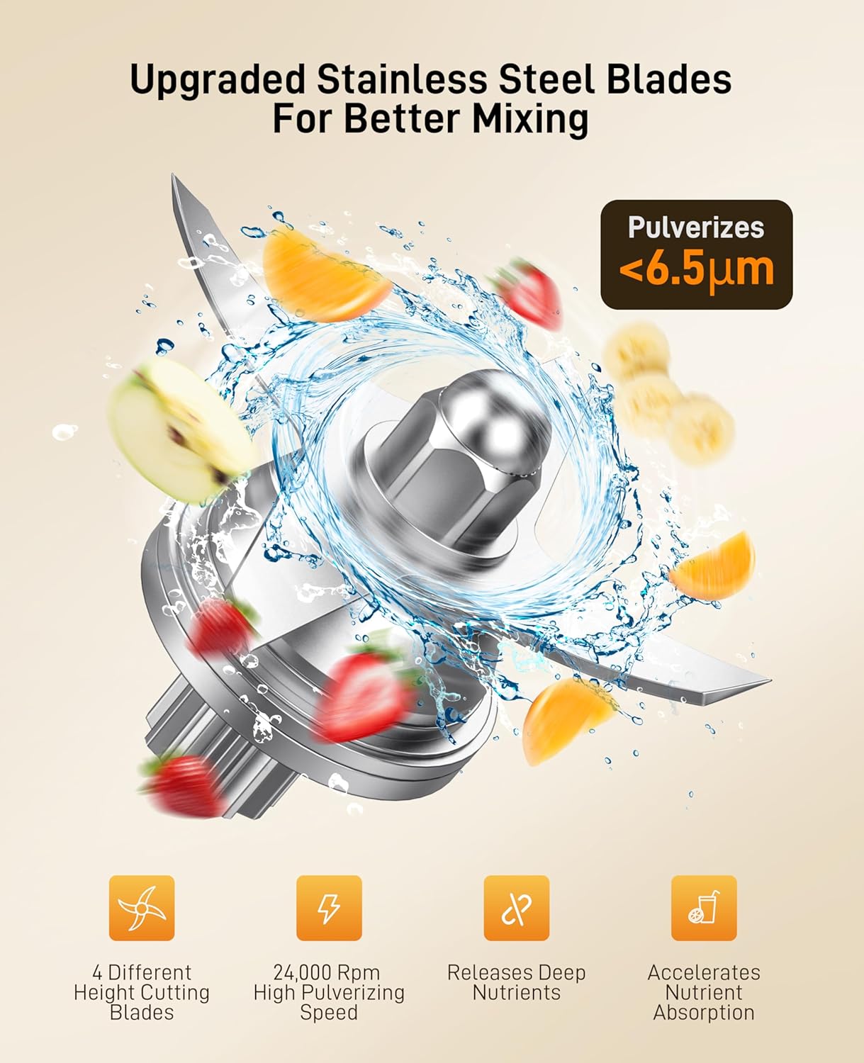 - Sharp Blade: The blade is made of one-piece 4 blades, die-cast high carbon steel with a laser cutting process on the surface, which makes the blade sharp, sturdy, wear-resistant and corrosion-resistant. It can easily crushes any food with speeds up to 38000 rpm, blend the ingredients faster and make the soup more delicate
