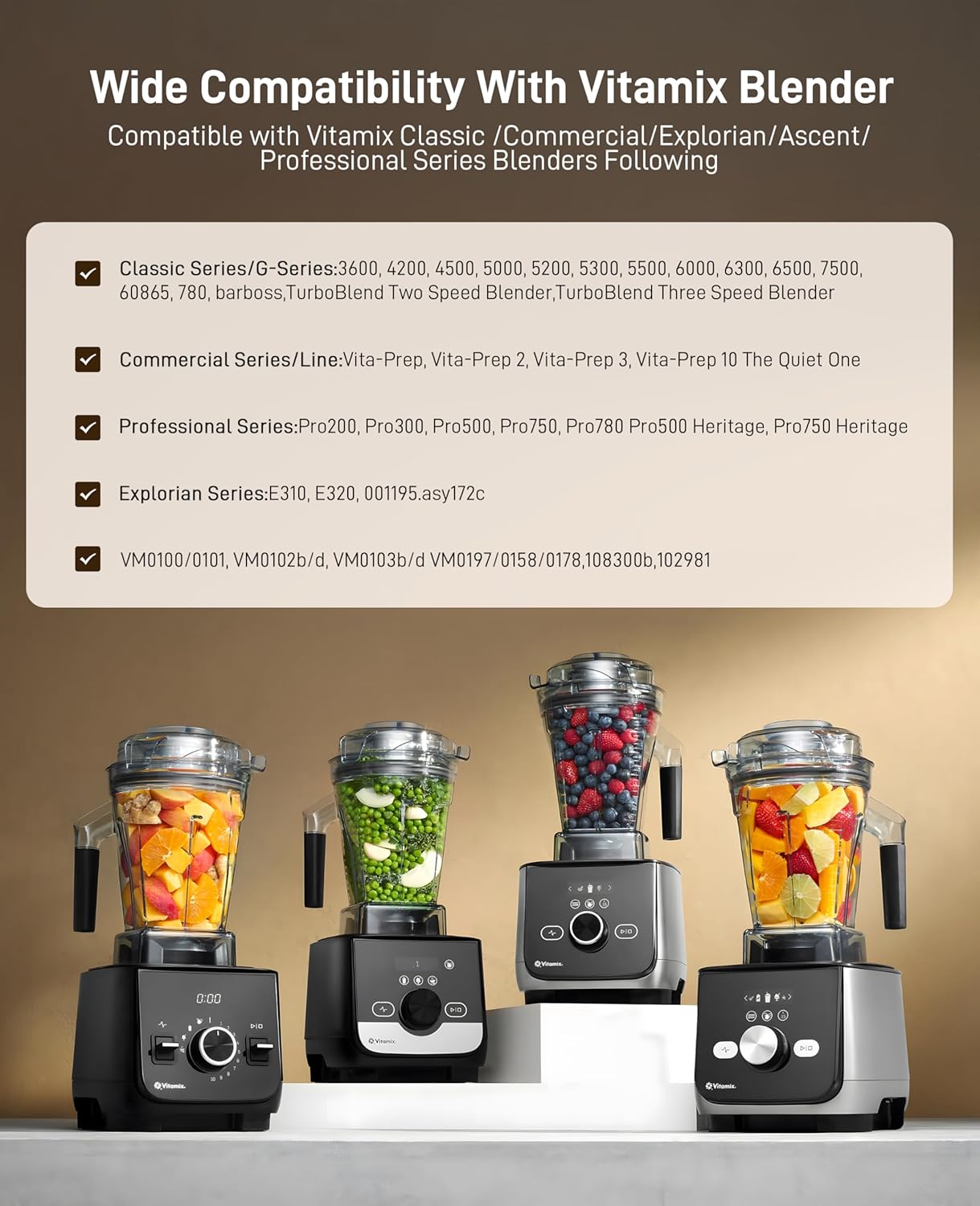- Wide Compatibility: This container pitcher compatible with Vitamix classic C series blender :4500, 5000, 5200, 5300, 6000, 6300, 6500, 7500,62828, 780,001195.Aspire ,asy172c. Explorian E310/ E320/E520, Professional Series 200/300/ 500/750, Creations II/ elite, vita prep 3, Total Nutrition Center 3, TurboBlend Two/Three, VM0100/0101, VM0102b/d, VM0103b/d, VM0197/0158/0178/185a,108300b102981