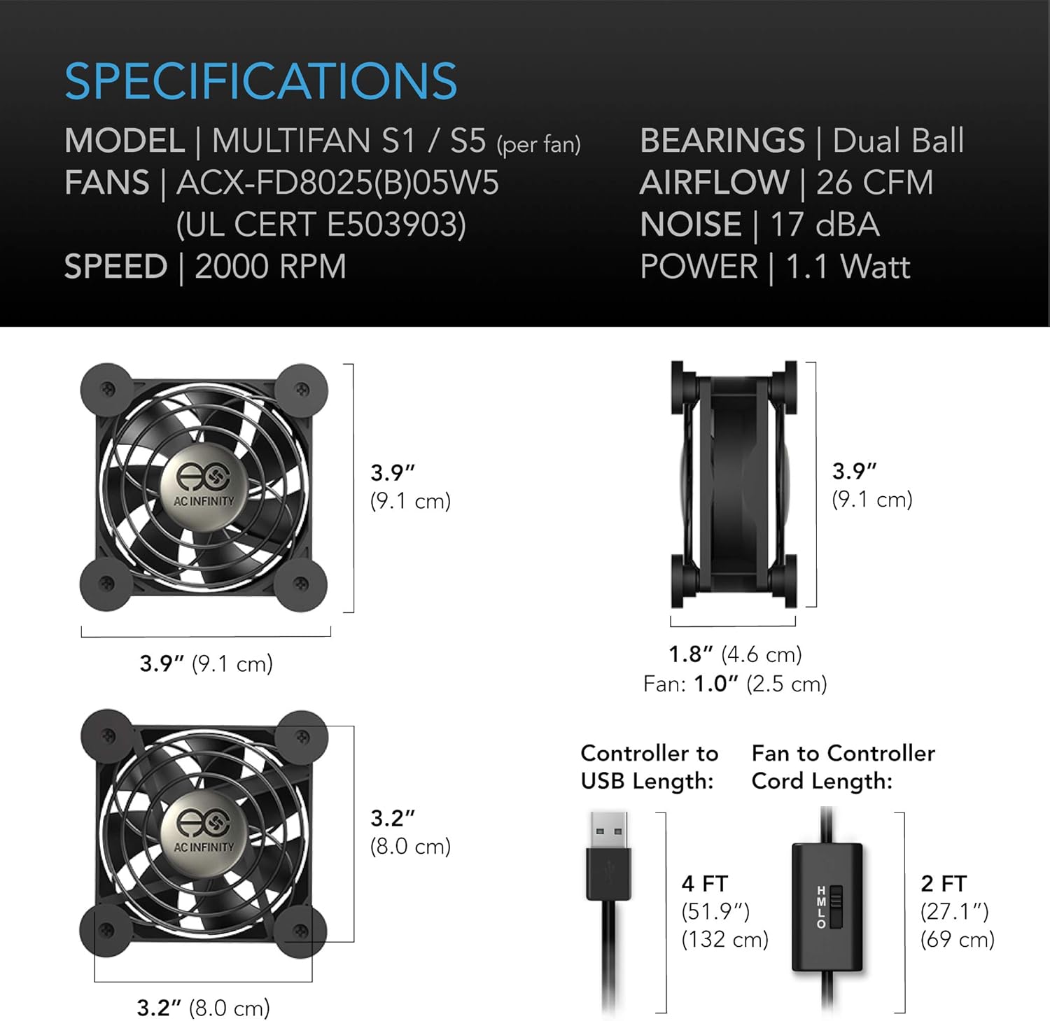 Dimensions: 3.2 x 3.2 x 1 in. per fan | Total Airflow: 52 CFM | Total Noise: 18 dBA | Bearings: Dual Ball
