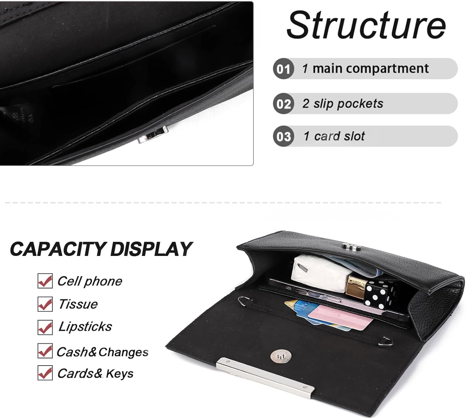 - Women's clutch handbags: Faux leather material outer,Magnetic snap closure and Silver-tone hardware.