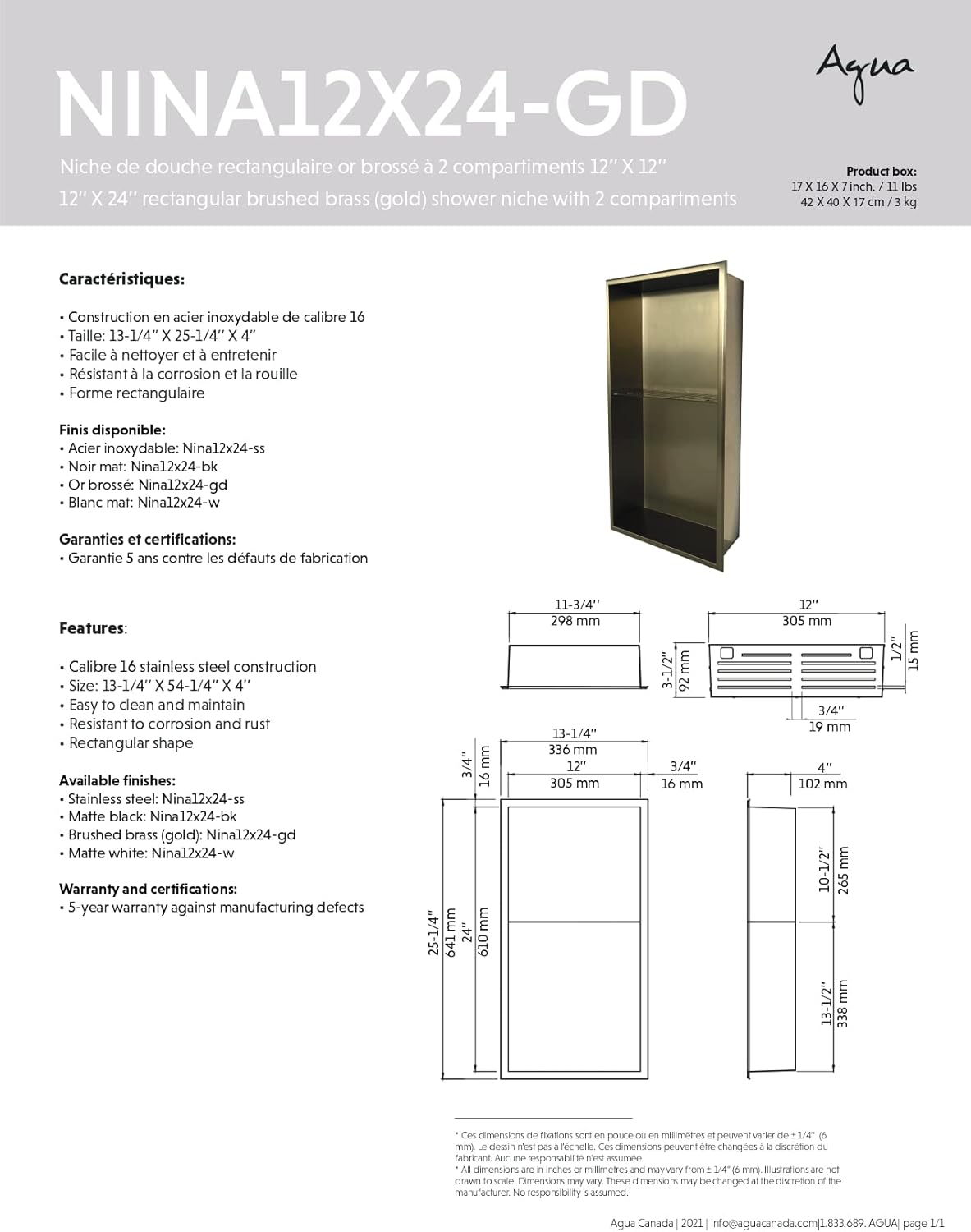 Agua Canada Shower Niche 12”x 12” Single Shelf Organizer Best Modern in Wall Bathroom Accessory for Shower or Tub Storage Insert Holds Soap Bottles Toiletries (GOLD) NICOLA12X12-GD