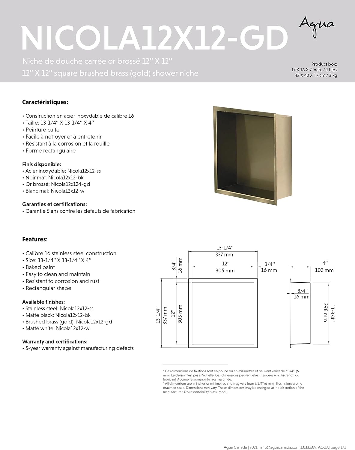 12”x 12” stainless steel shower nicheCalibre 16Baked paintStainless steel finish Stainless steel provides durability and longevity Shower niche offers the practical convenience of recessed shelving within your shower or bathroom