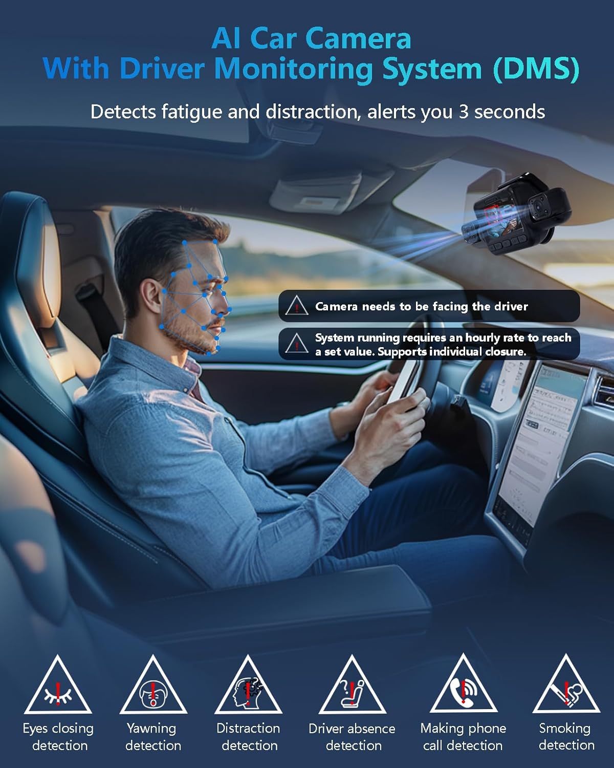 • 【AI Dash Camera with DMS】The V8Pro dashcam is AI Dash Cam with Driver Monitoring System, fatigue driving detection is an advanced AI in-vehicle safety technology that is primarily used to monitor driver behavior and status to ensure driving safety. The main functions include, distracted driving detection, yawning detection, driver absence detection, making phone call detection, and smoking detection. These features help to improve driving safety and comfort