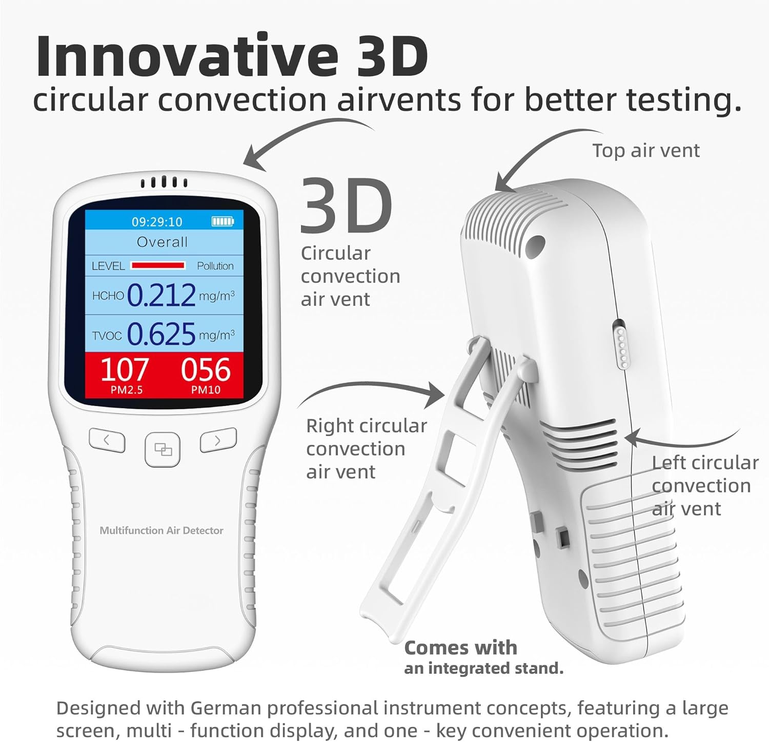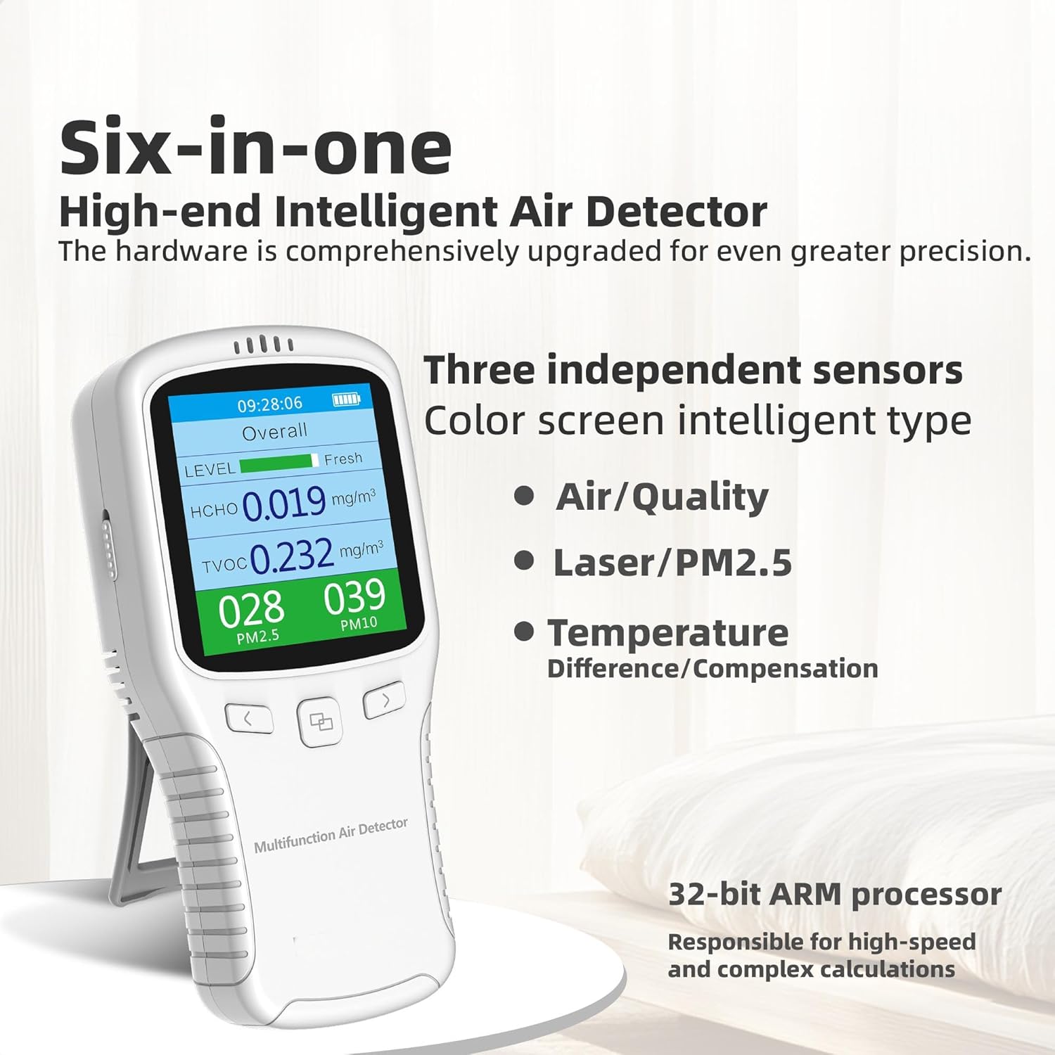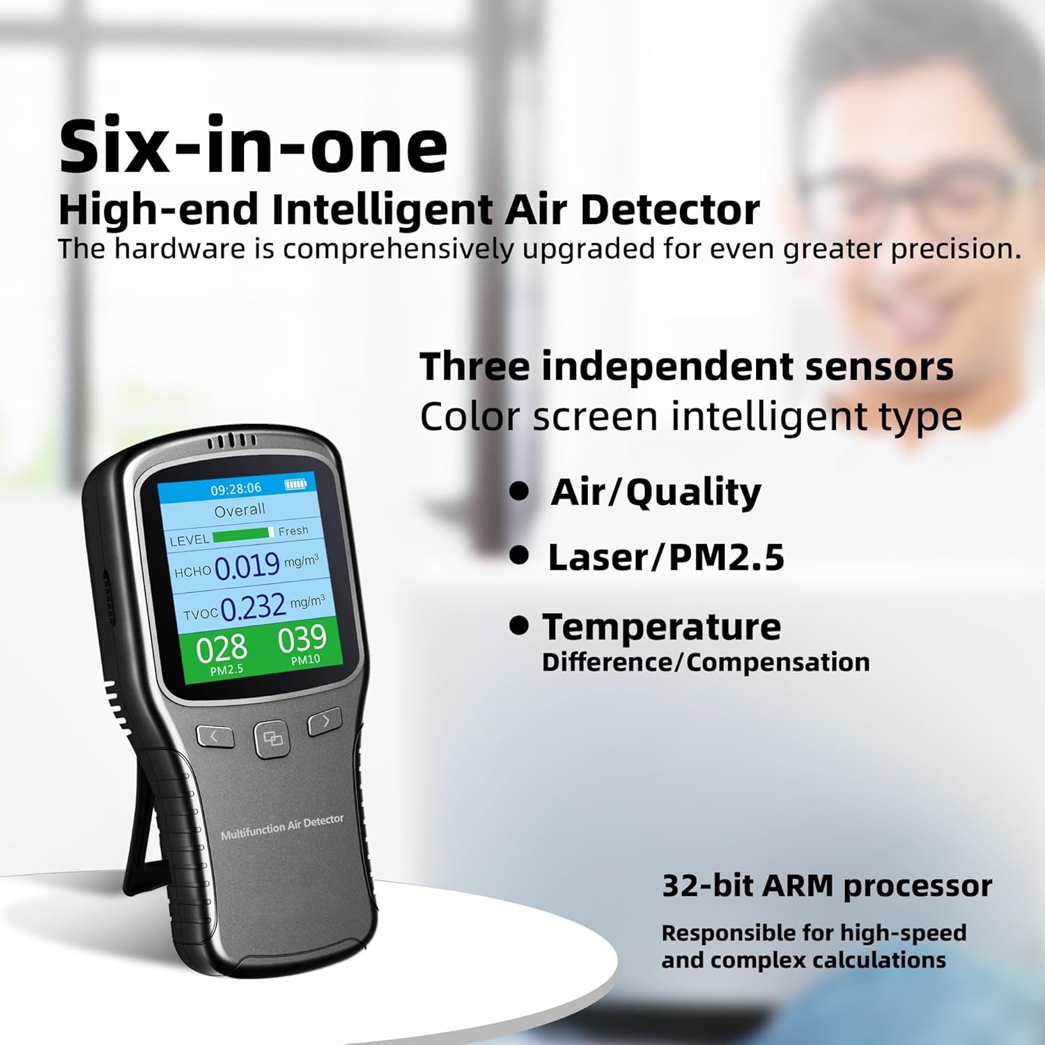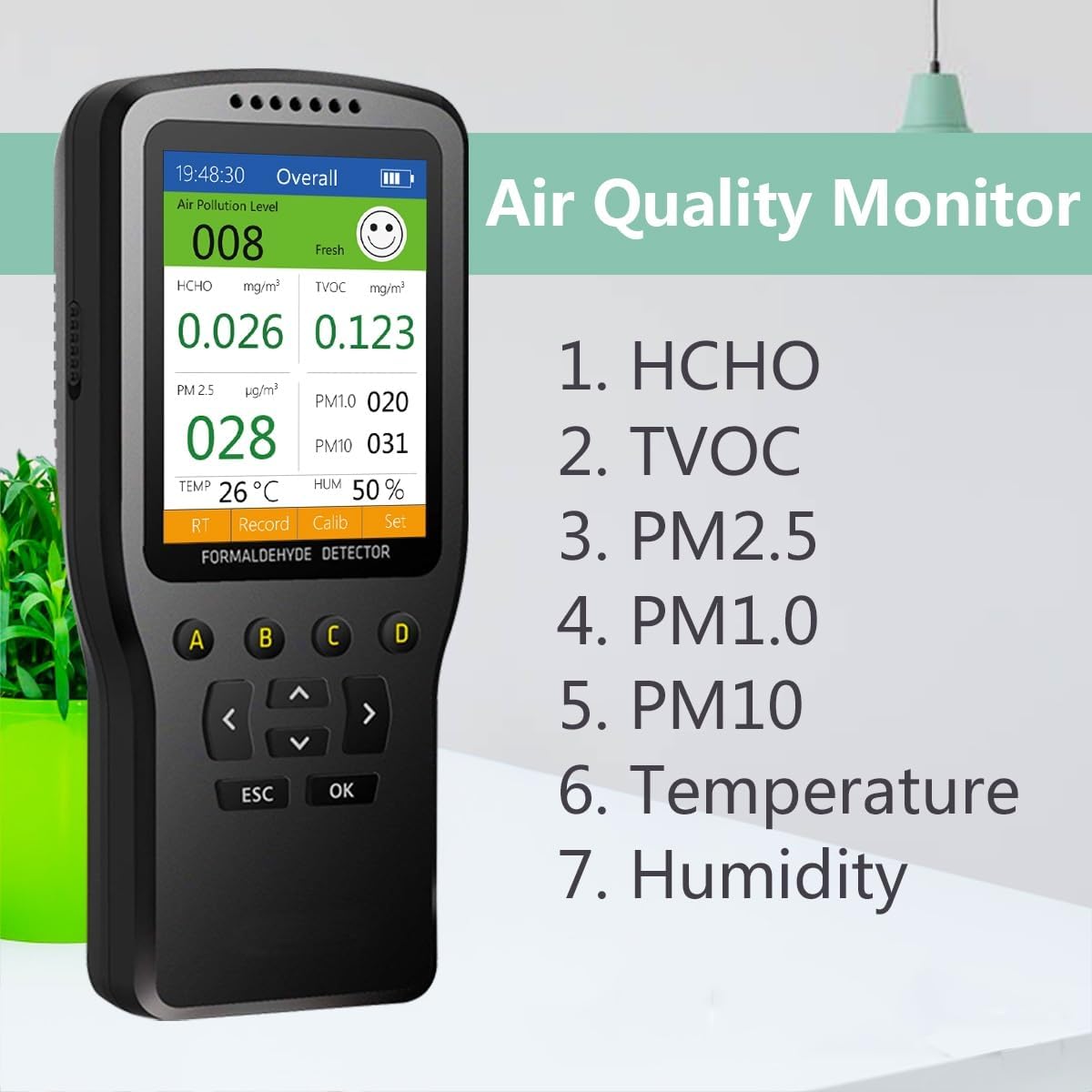 - 【Multifunctional & Air Quality Monitor】 Measures 8 key parameters for comprehensive air quality control: Formaldehyde (HCHO), Volatile Organic Compounds (TVOC), Particle Matter (PM10/PM2.5/PM1.0), Temperature (in ℃), Humidity (in %). Safeguards family health.For more accurate readings, it is recommended to close doors and windows and let the device operate for 15 minutes. When using for the first time or after long-term storage, please place it in a ventilated environment for at least 1 hour to ensure data accuracy.