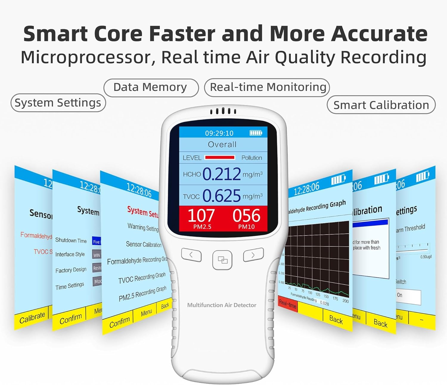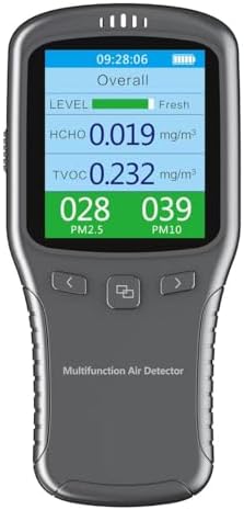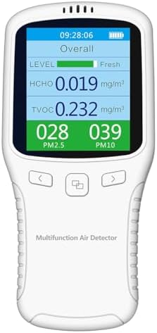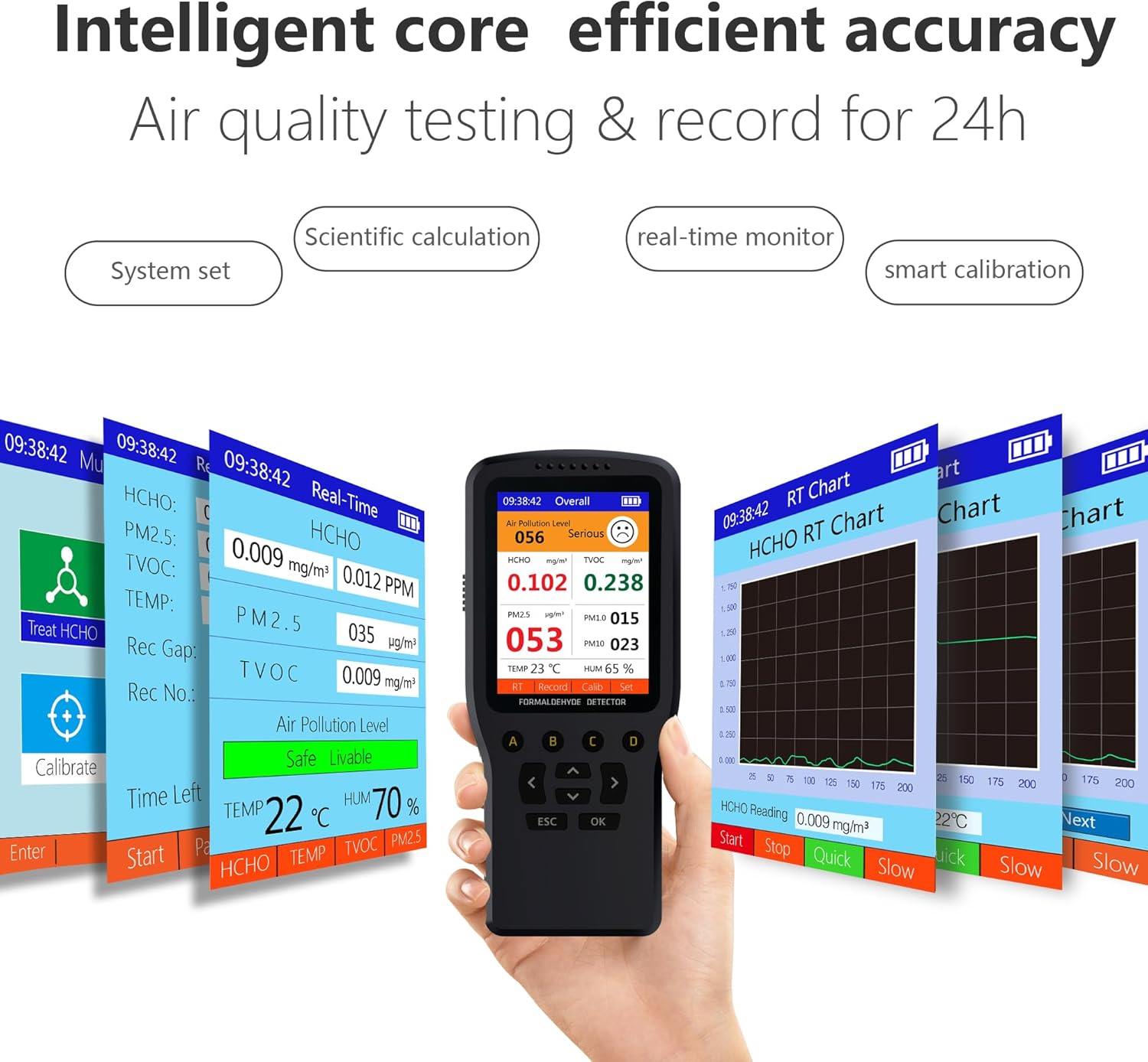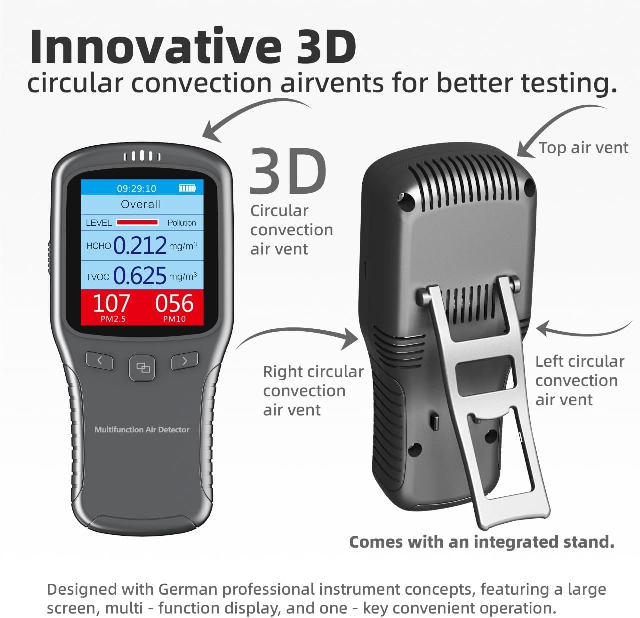- 【Multifunctional & Air Quality Monitor】 Measures 8 key parameters for comprehensive air quality control: Formaldehyde (HCHO), Volatile Organic Compounds (TVOC), Particle Matter (PM10/PM2.5/PM1.0), Temperature (in ℃), Humidity (in %). Safeguards family health.For more accurate readings, it is recommended to close doors and windows and let the device operate for 15 minutes. When using for the first time or after long-term storage, please place it in a ventilated environment for at least 1 hour to ensure data accuracy.