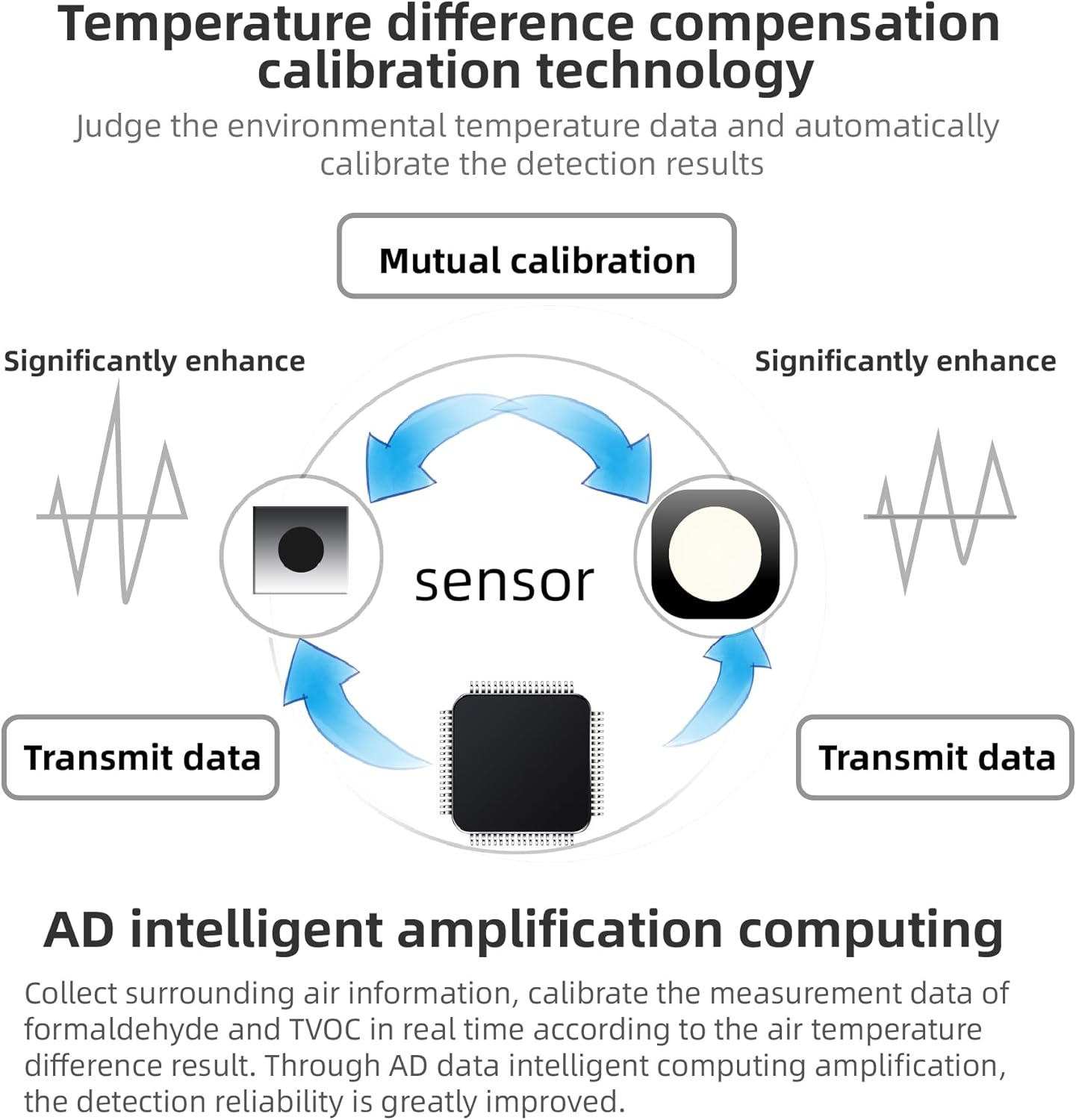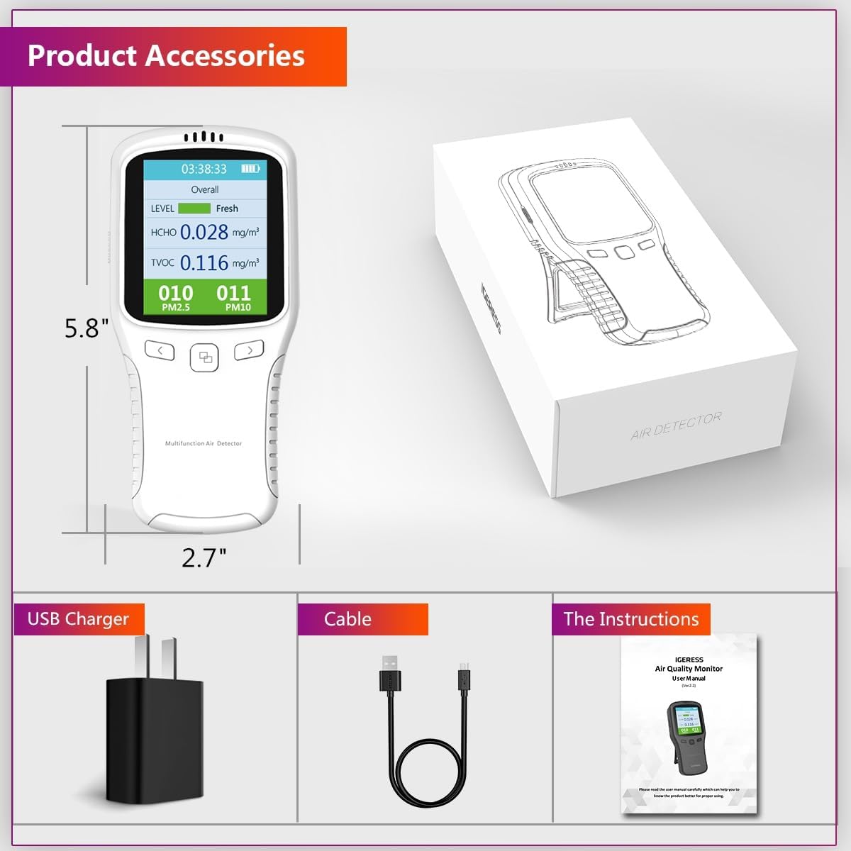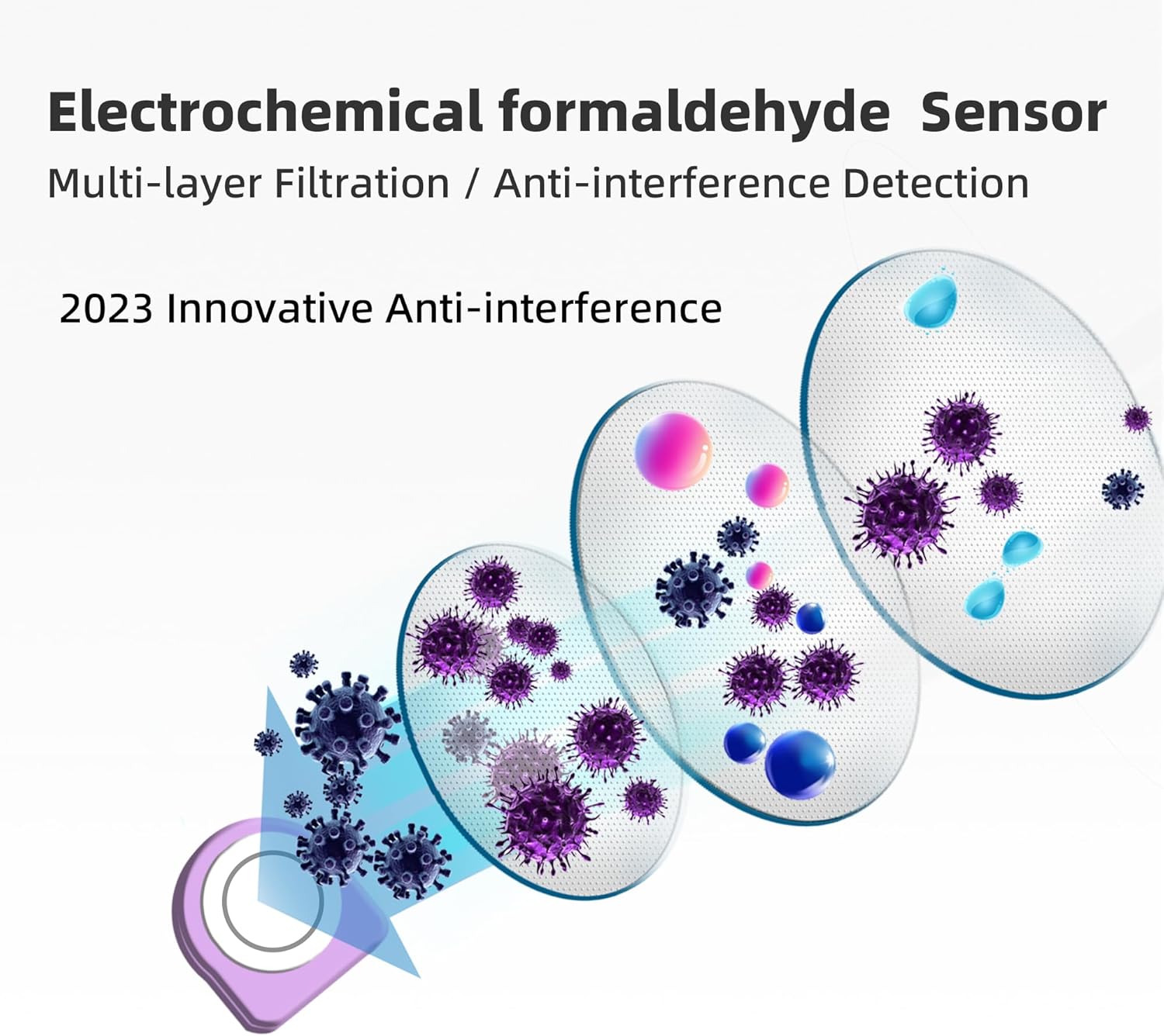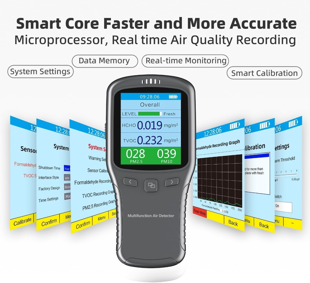 - 【Multifunctional & Air Quality Monitor】 Measures 8 key parameters for comprehensive air quality control: Formaldehyde (HCHO), Volatile Organic Compounds (TVOC), Particle Matter (PM10/PM2.5/PM1.0), Temperature (in ℃), Humidity (in %). Safeguards family health.For more accurate readings, it is recommended to close doors and windows and let the device operate for 15 minutes. When using for the first time or after long-term storage, please place it in a ventilated environment for at least 1 hour to ensure data accuracy.