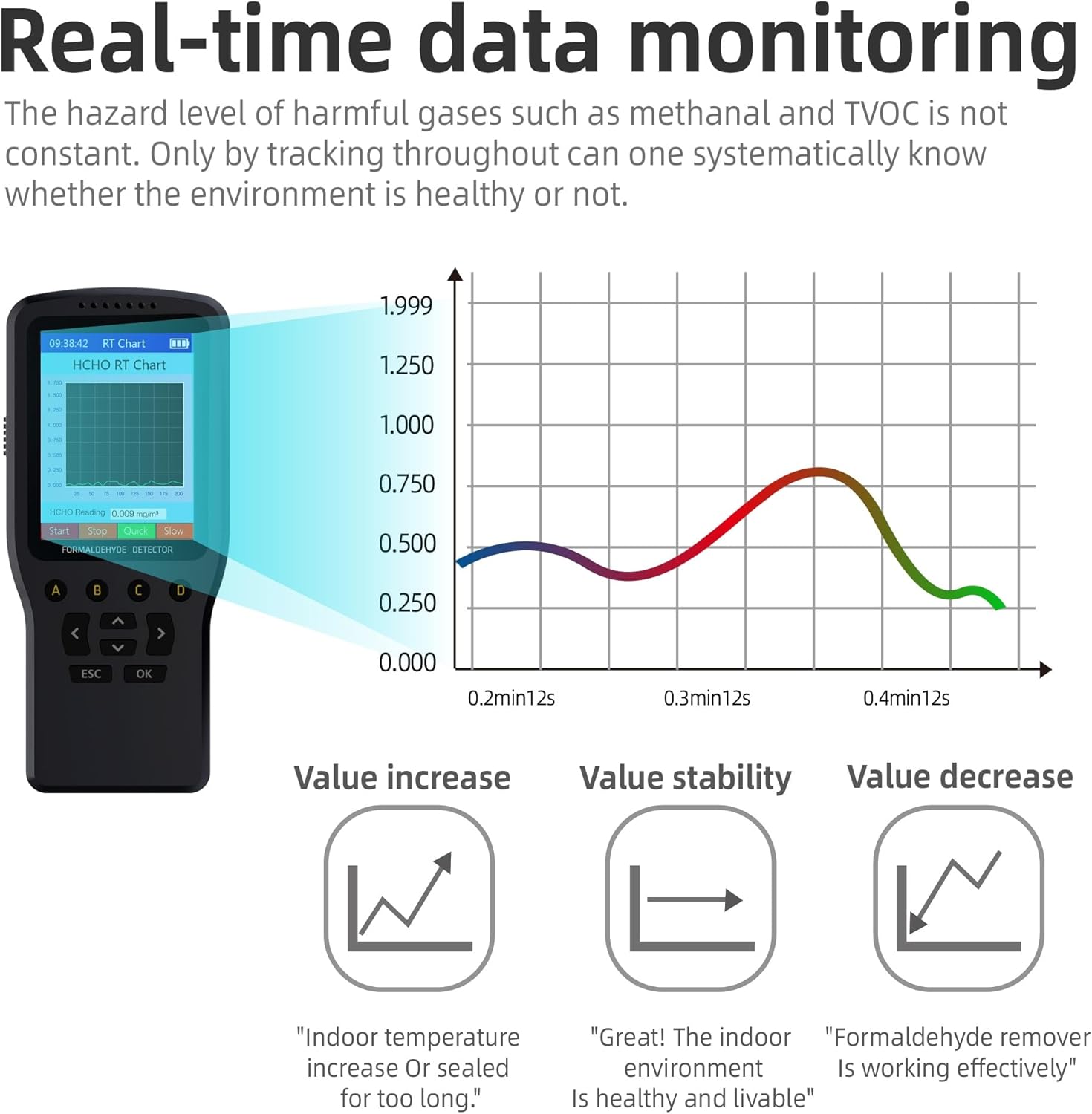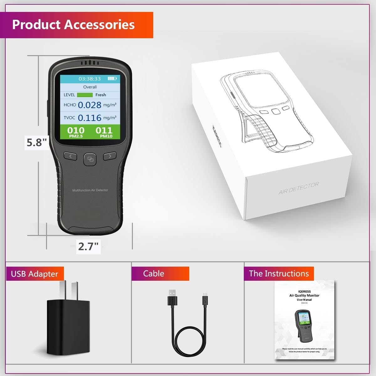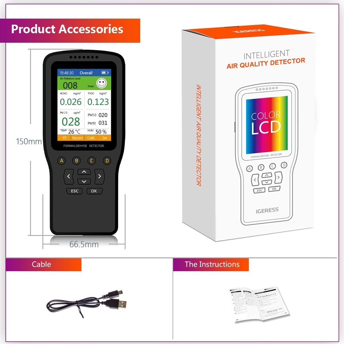 - 【Wide Application】 Portable intelligent monitor detects harmful substances like HCHO and TVOC in various environments: home, office, car, hotel, kitchen, bedroom, etc.
