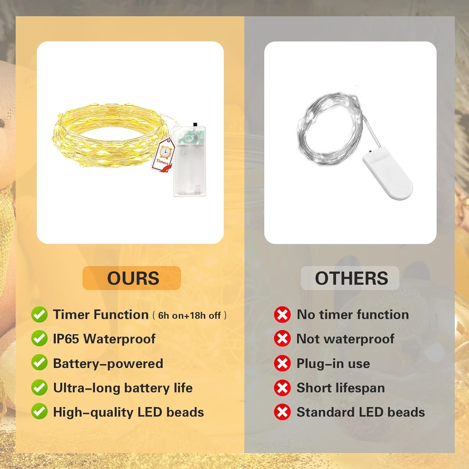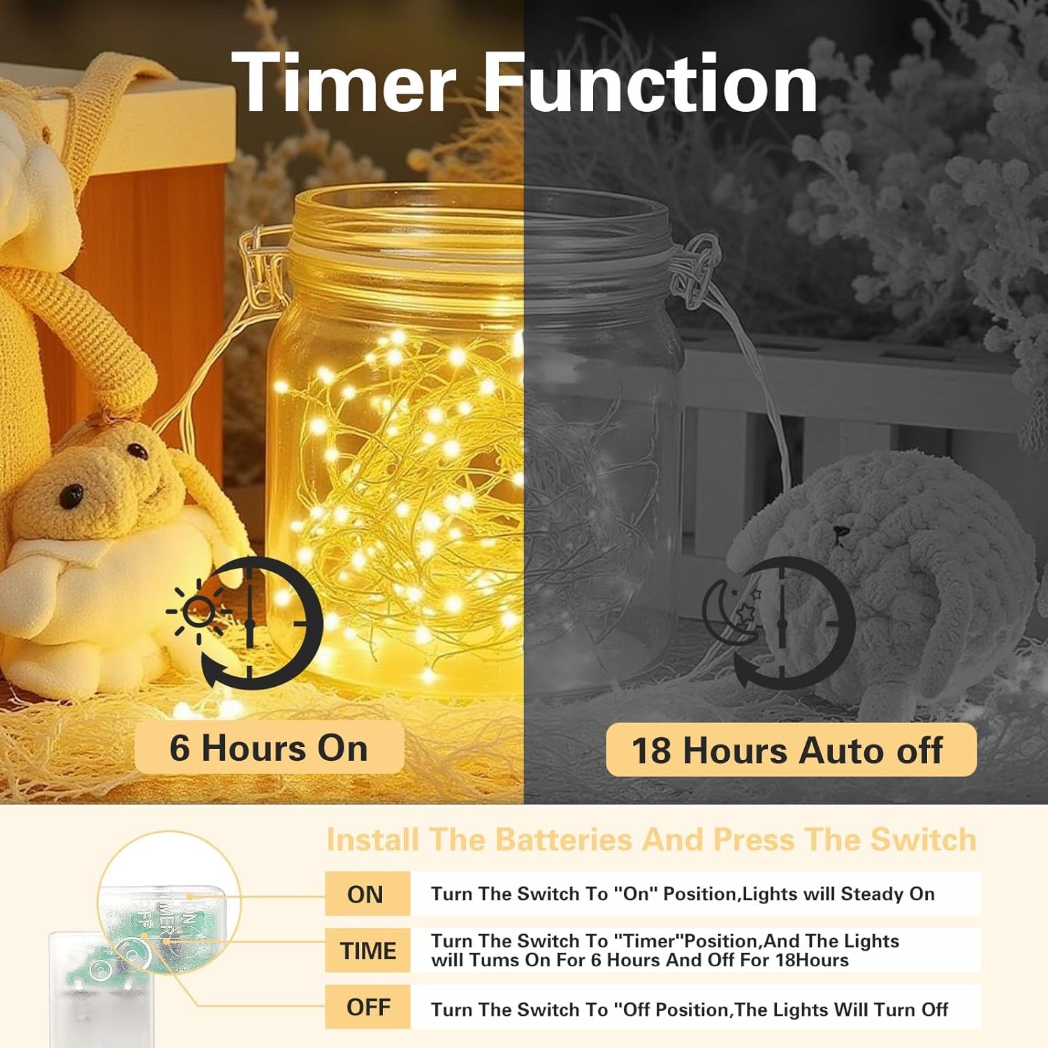 - ⏱️ Built-In Timer & Long Battery Life Features a 3-way switch (ON/TIMER/OFF) with a 6-hour on / 18-hour off timer cycle. Each strand runs up to 120 hours on 2 AA batteries (not included), making them energy-efficient and low maintenance.