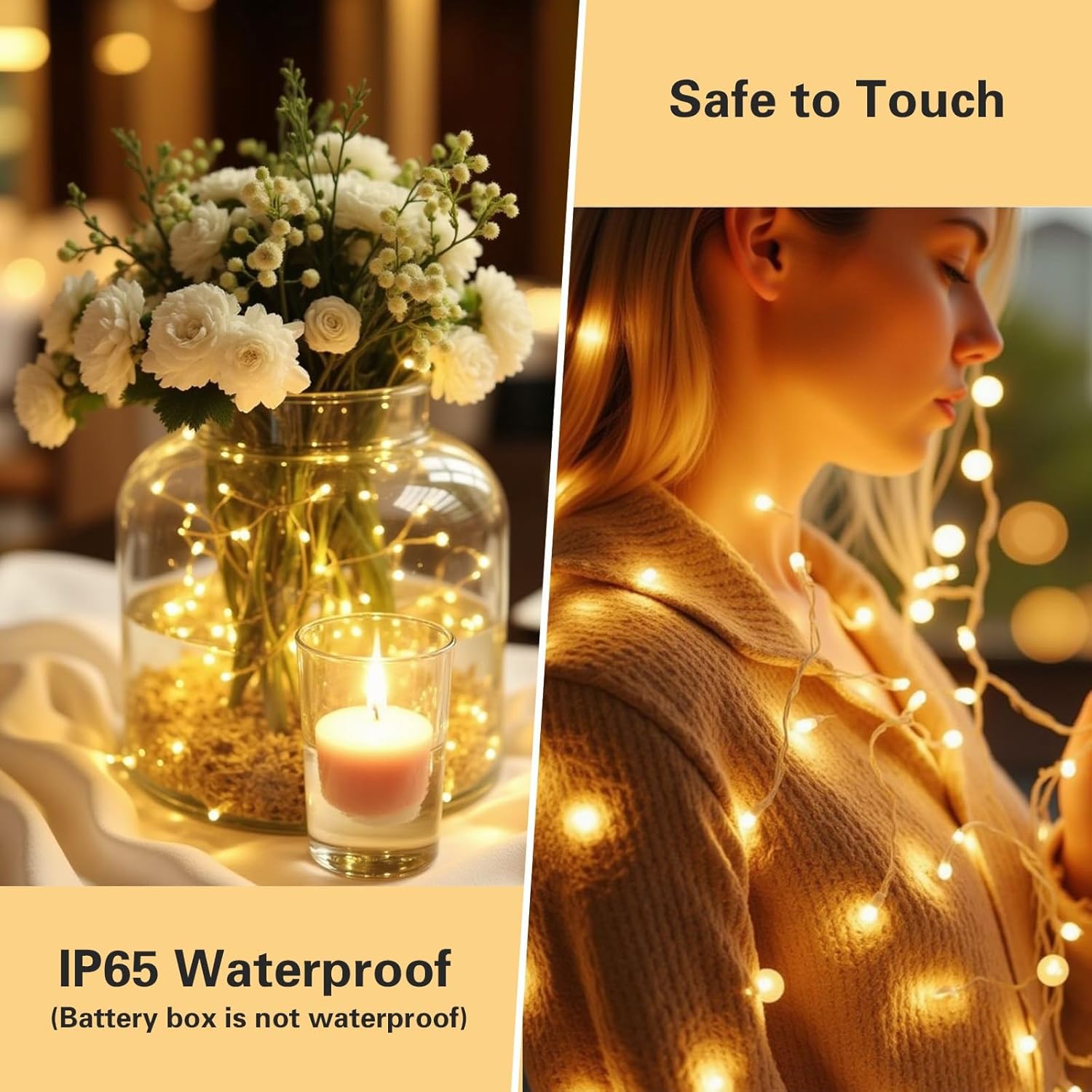 - 💧 Indoor Water-Resistant & Safe to Touch The LED string is rated IP65 water-resistant (battery box not waterproof). Low-heat lights remain cool even after hours of use—safe for kids, pets, and hands-on projects.