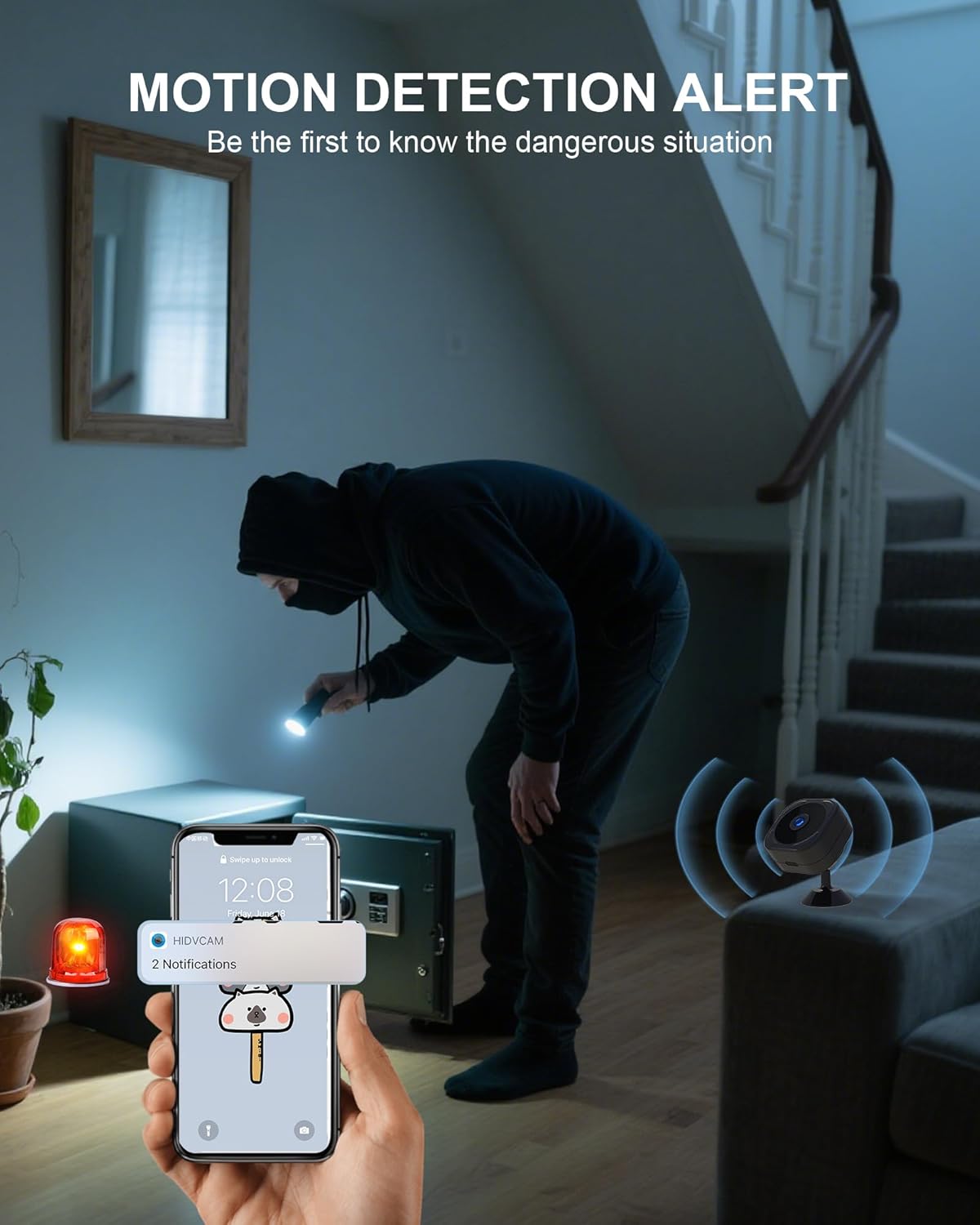 • Motion Detection Alerts, Fast and Accurate: The A12 mini camera's Motion Detection feature identifies changes in a scene by comparing differences between consecutive frames, and when enough changes are detected, the wifi camera triggers an alert or starts recording and pushes you an alert notification as soon as possible, ensuring that you don't miss a critical moment. This means there is no need to waste time viewing long periods of inactive video, thus increasing surveillance efficiency