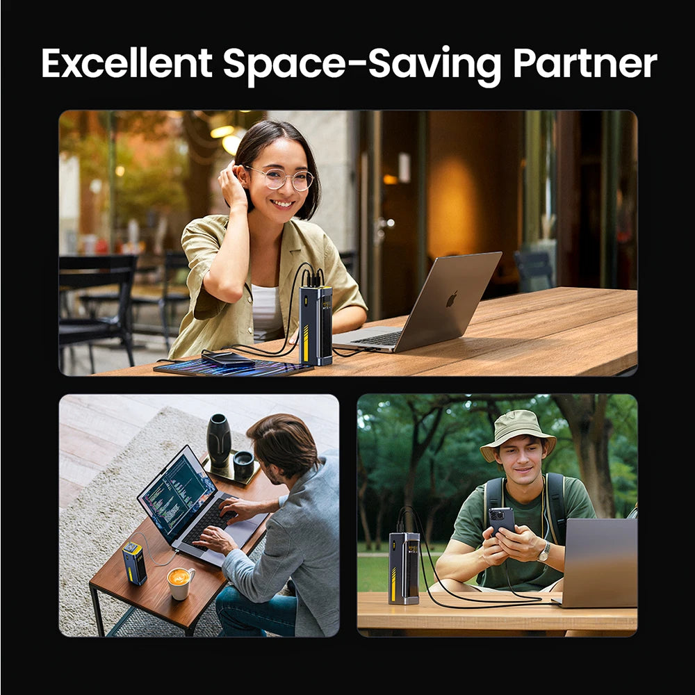 Compact as a can (2.09in*2.56in*6.77in), it features three USB-C 140W ports and one USB-A port to accommodate your daily needs and a variety of fast-charging options. It's ideal for keeping devices powered up during travel and commutes, perfect for professionals who need a reliable laptop power bank and efficient charging station.