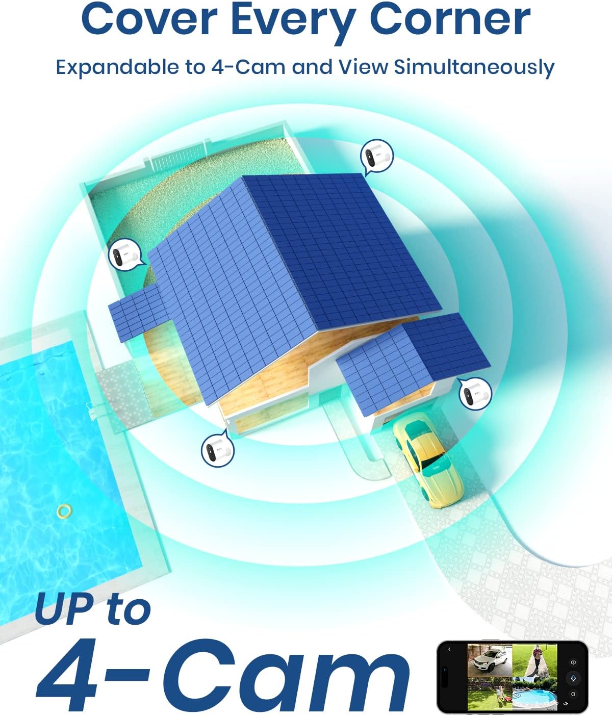 - Maximize Security Coverage - 166° ultra-wide angle lens provides complete coverage without any blind spots. Live view all outdoor security cameras (expandable up to 4 cameras) at once on a single screen, providing you with unparalleled visibility and control over your property. Rest assured that your home will be fully protected.