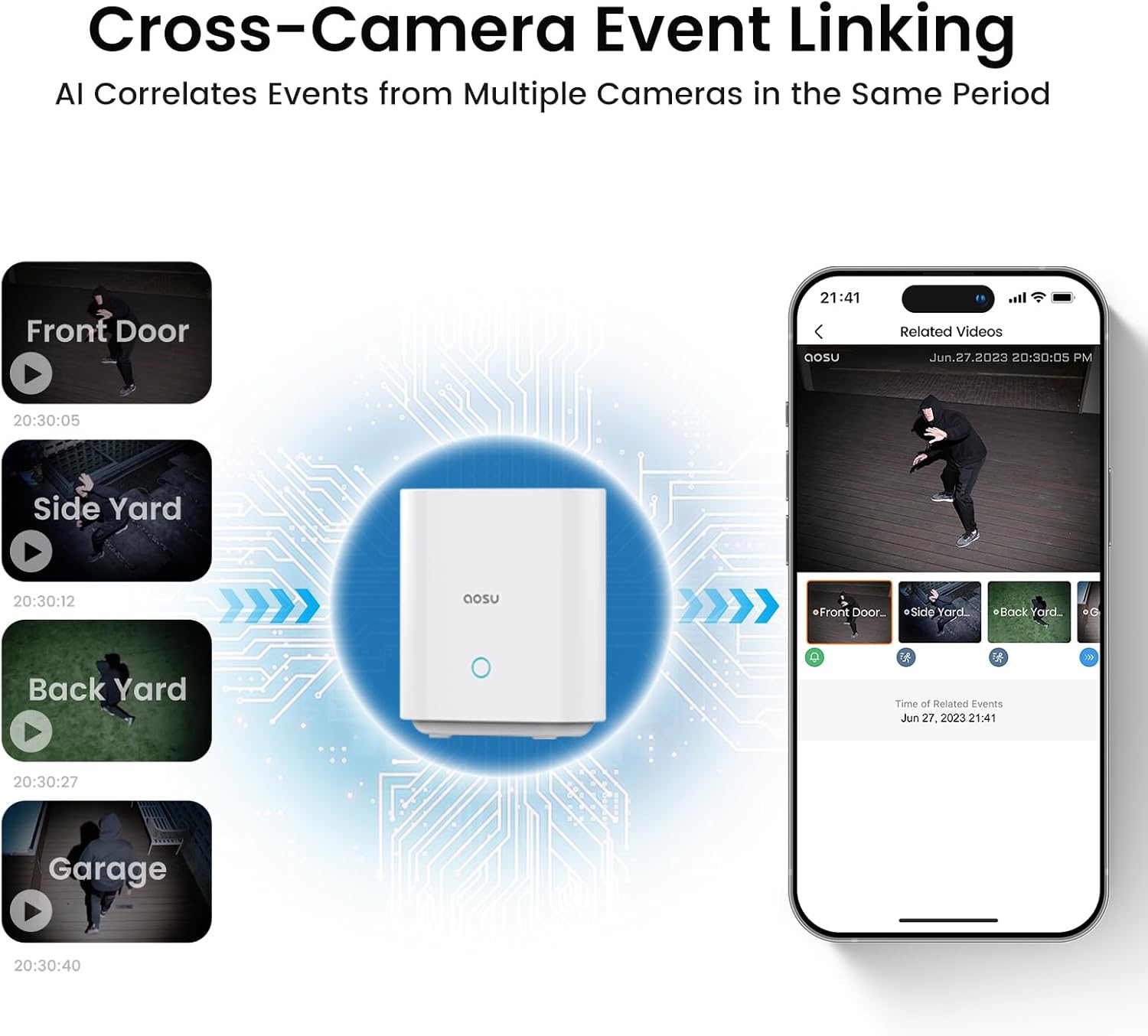 - Advanced Encryption and Free Local Storage - Remotely access your locally secured smart camera footage from the included hub (built-in 32GB for up to 4-month of loop recording). Keep your home secure with aosu reliable home security camera solution - WirelessCam Pro System.