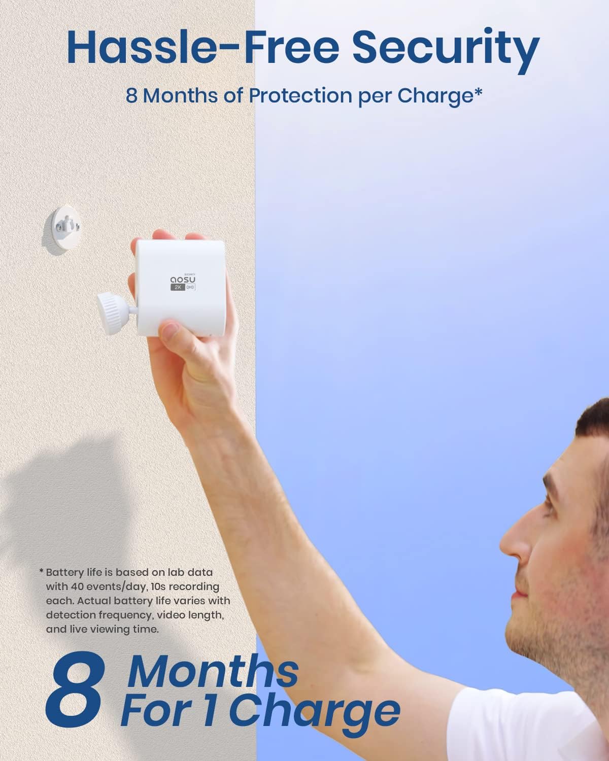 - Hassle-Free Wireless Security - Don't need to frequently recharge your home security system surveillance camera, enjoy flexible, wire-free installation with up to 240-day of battery life per charge*. aosu makes security cameras easy and convenience to any users. *Battery life is based on lab data with 40 events/day, 10s recording each. Actual battery life varies with detection frequency, video length, and live viewing time.